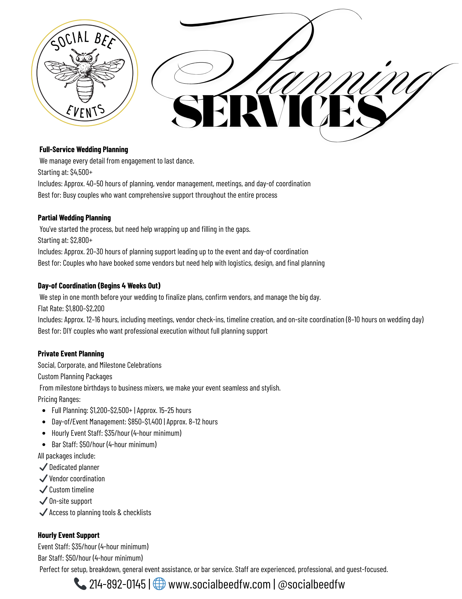 Social Bee Events was an outstanding catering choice for our wedding. Their communication was efficient, above and beyond, and incredibly helpful throughout the entire planning process. The quality of their work was truly unique and beyond comparison - from prepping the venue and after party details to seamlessly coordinating our timeline and photography, their dedication and delicate attention to every aspect of our special day was unparalleled. We could not have asked for a more professional and capable catering team to make our wedding dreams a reality. We are forever grateful for Social Bee Events and the incredible experience they provided.