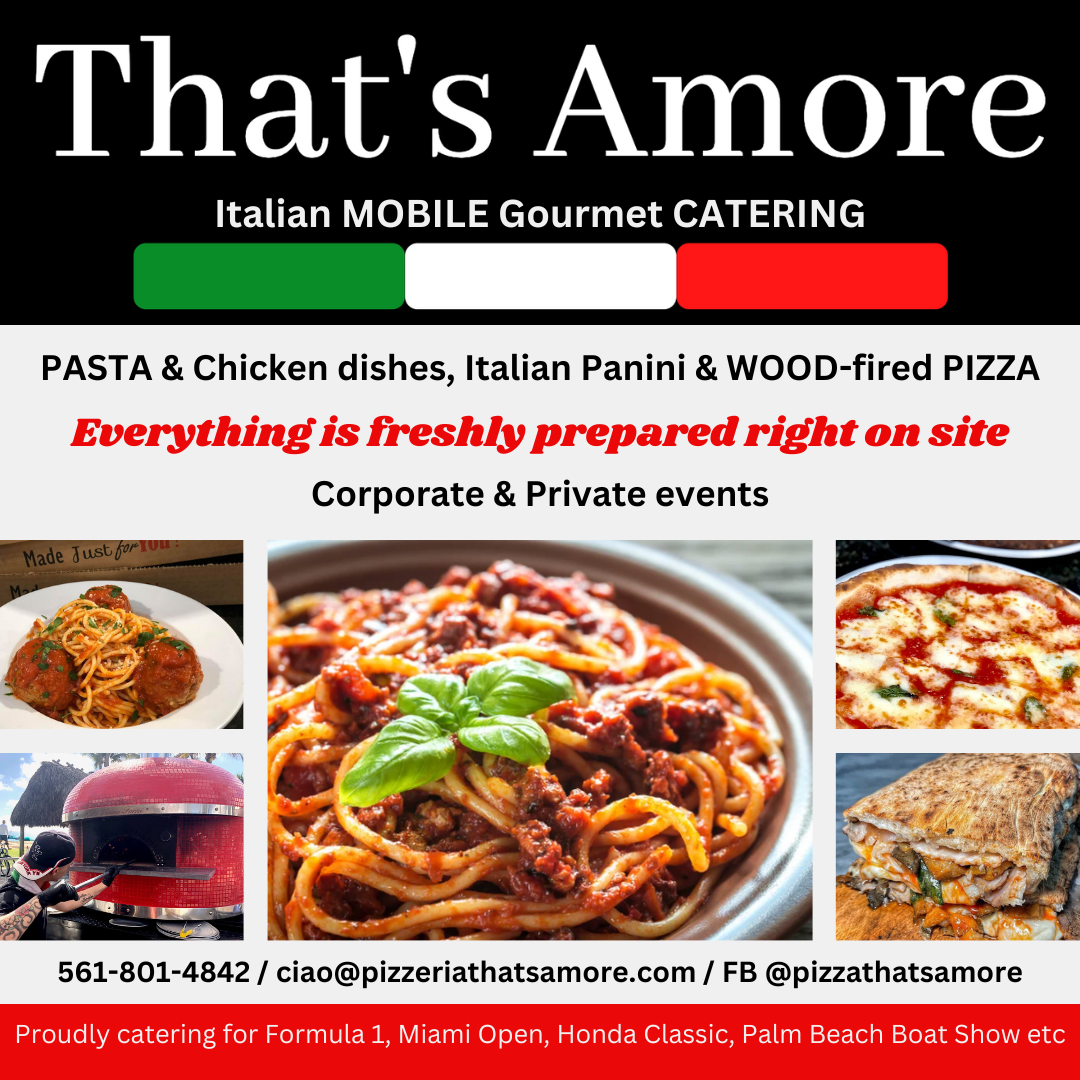 Contact us by email: Ciao AT pizzeriathatsamore com. That's Amore WOOD-fired PIZZA and Pasta Catering, straight from the heartlands of South of Italy! We use an authentic, hand-built brick oven, fueled only by wood, to bring you a bite of Italian tradition you can't resist! Our wood-fired pizza & pasta journey started in the kitchen of Chef Giuseppe’s mother and grandmother. Our experience goes from catering for Formula 1 & Miami Open at Hard Rock Stadium to Indy500! So wherever you have 50 guests or 500 we can manage it! We are a preferred catering vendor at Ever After Farm Wedding Venue