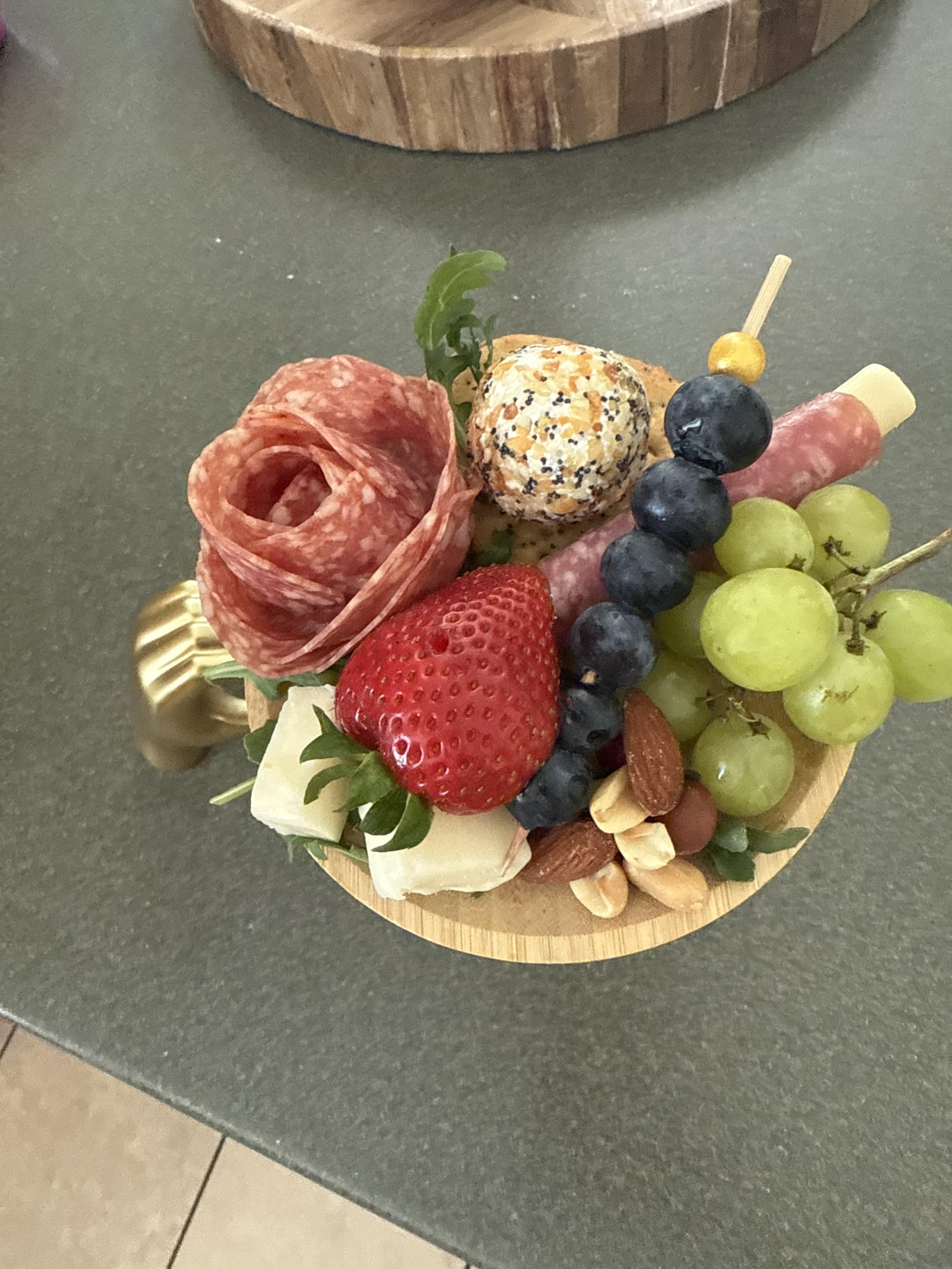 Our mobile charcuterie bars are designed specifically for any special event , ensuring each offering reflect quality and elegance tailored for each client . We offer two types of elegant presentations with our mini boards or our mini wine toppers ! Both presentations feature a selection of cured meats, artisan cheese , seasonal fruits and floral garnishes.