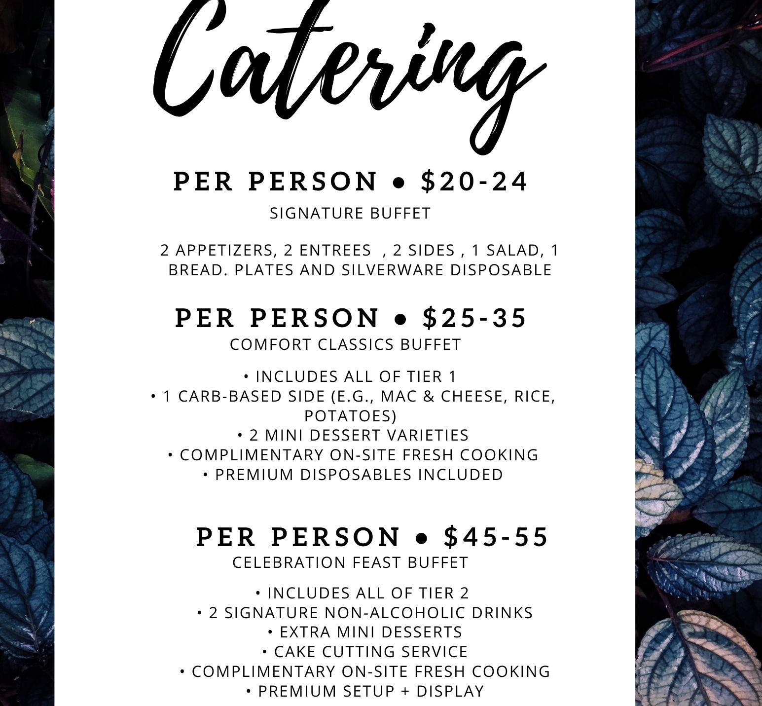 We specialize in affordable, all-inclusive wedding catering with homemade food and personalized service. Whether you’re dreaming of Southern comfort, a multicultural menu, or a magical themed feast, we’ve got you covered with fully customizable packages for all budgets and guest counts. Because we’re a small team, we ask for up to 24 hours to respond to all inquiries — but we promise it’s worth the wait. Each wedding is personal to us, and when it’s your turn, you’ll get our full attention, creativity, and dedication. Let us help you create something unforgettable — delicious, heartfelt, and totally you. 💖