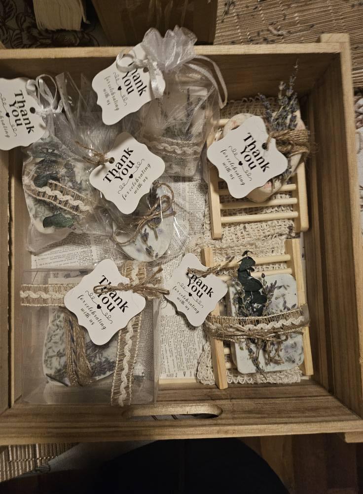 Barb made beautiful soaps for our wedding/ vow renewal celebration. My guests kept bragging about their party favors. They smelled amazing and the design was absolutely perfect! Communication was great, Barb was so professional and kind, she listened so carefully and had so many ideas and opinions, she went above and beyond even coming up with personalized name tags and overall name for our soaps and a perfect basket to hold them in. I absolutely 100% recommend. Soaps are organic and feel so good and soft on your skin. Thank you, we are so grateful!