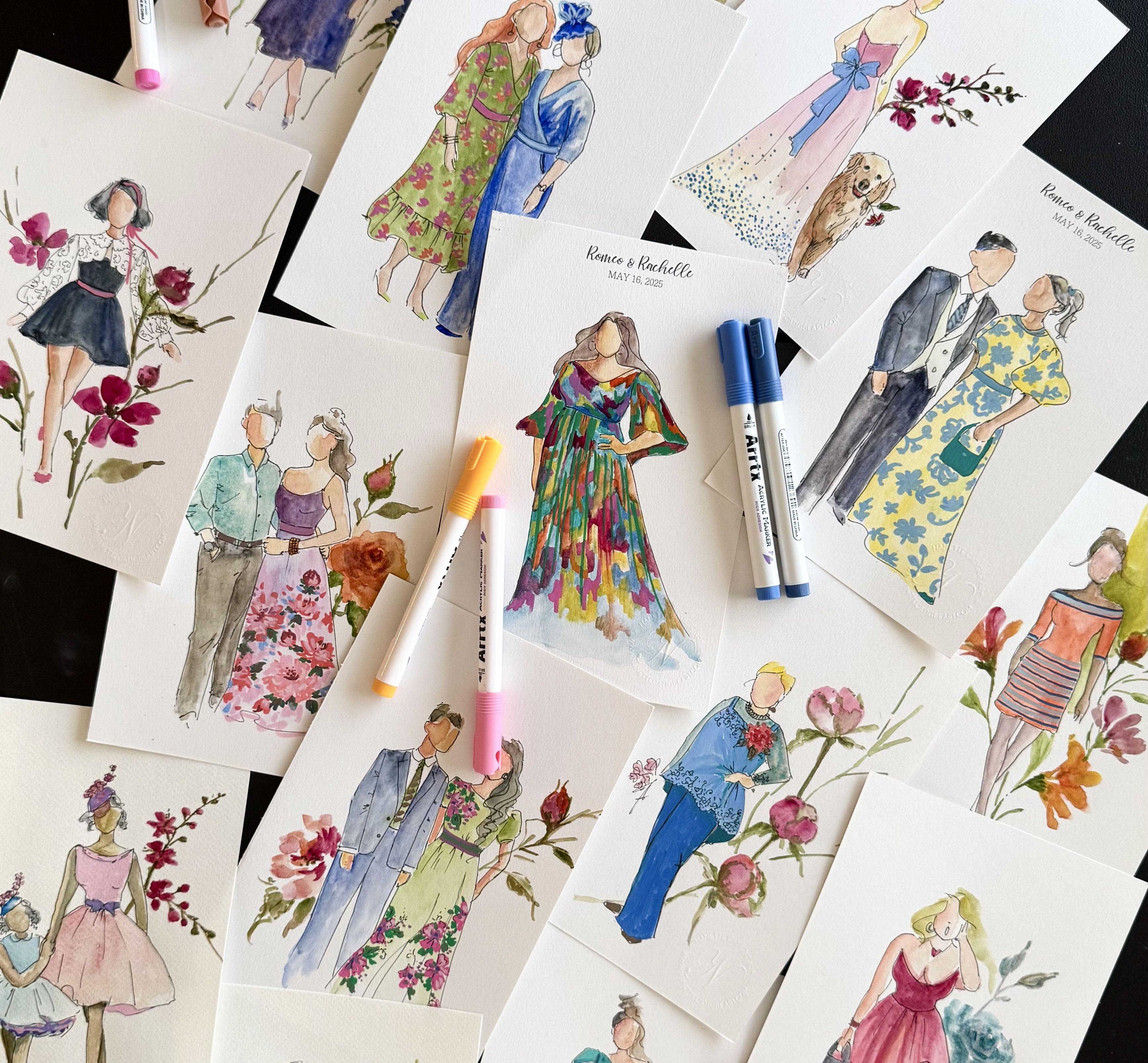My daughter, Chiara, and I create live guest illustrations on-site during your wedding reception. Each portrait is hand-painted in watercolor or ink and beautifully packaged so guests can take home a meaningful keepsake the same day. This experience adds beauty, interaction, and a touch of artistry to your celebration—something guests will talk about long after the wedding day.