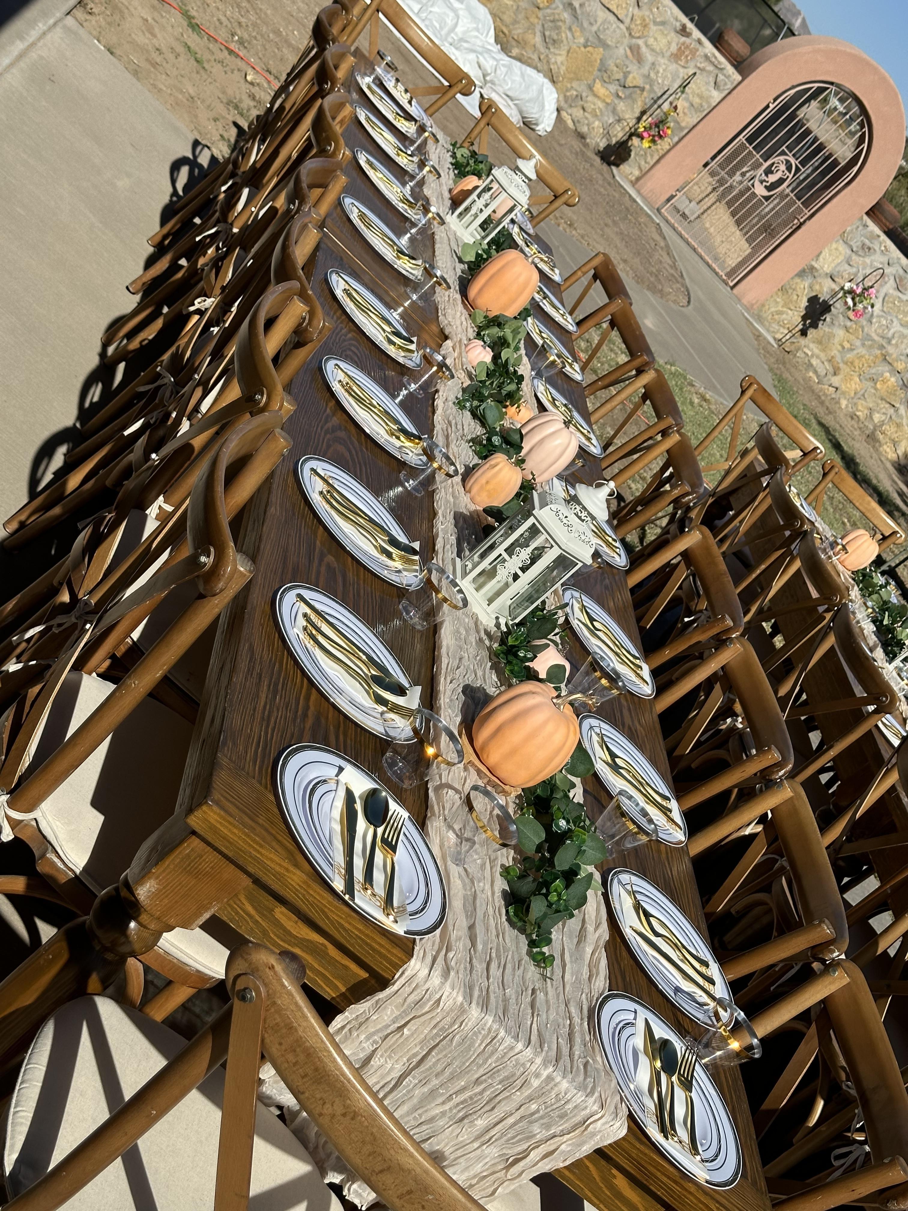 I used splendid settings for my baby shower i had in November. My visions was fall vibes, rustic And earth tones. Thanks to these tables and chairs my vision was accomplished. The tables were perfectly sized right. These aren’t cheap plywood or plastic tables. They perfectly paired with table runners only no need to cover them.