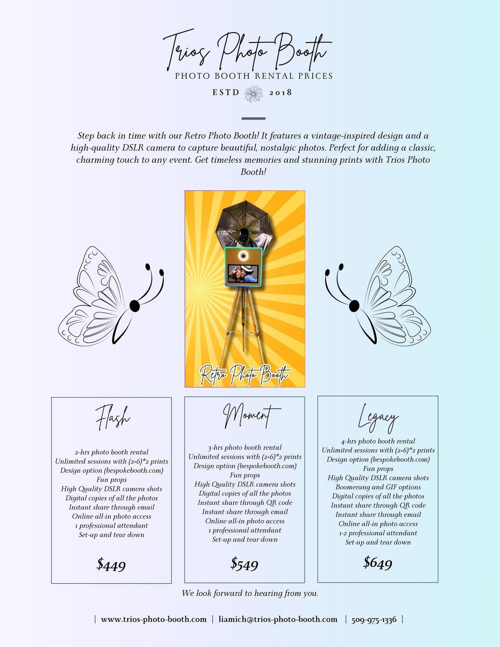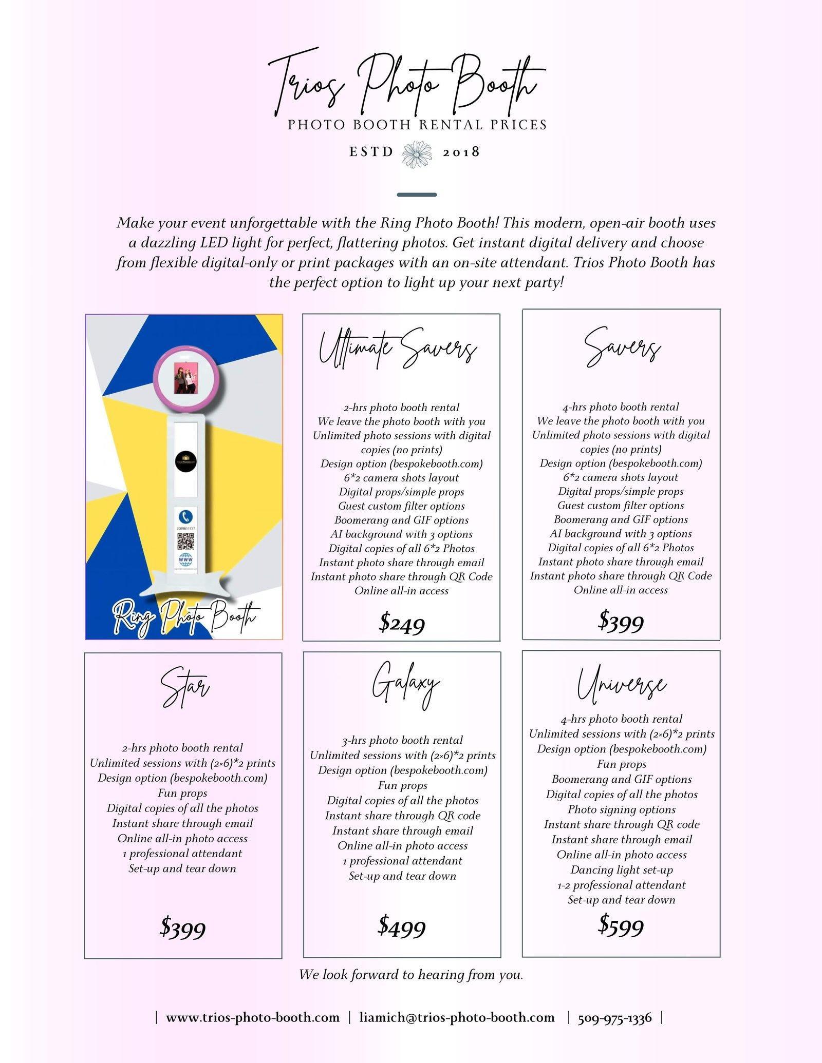Trios Photo Booth brings unparalleled fun to Tri-Cities, WA's wine country. We offer top-tier photo booth rentals for weddings, corporate events, and parties in Richland, Kennewick, and Pasco. Choose from our modern mirror booth, ring booth, or retro options, all with high-quality cameras for stunning prints and digital photos. Our packages feature unlimited sessions, props, custom backdrops, and instant sharing. Perfect for wine country weddings or any Tri-Cities event, our professional service guarantees lasting memories. Contact Trios Photo Booth for unforgettable entertainment in the Tri-Cities, WA!
