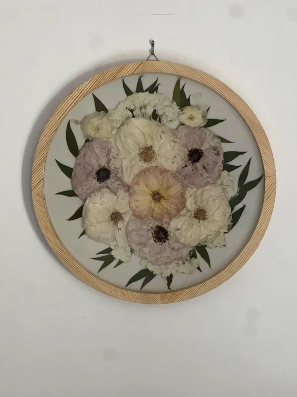 Our premium wood wall frame transforms your wedding bouquet into stunning 12x16 wall art, where your flowers are expertly pressed and preserved in UV-resistant epoxy to create a lasting display that outperforms traditional glass framing.