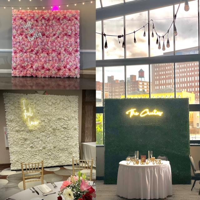 My standard flower wall colors include green, white, and pink. I can customize any of my standard walls with add-ons such as neon signage, additional flowers to match your wedding colors, and wood signage for an additional cost.
