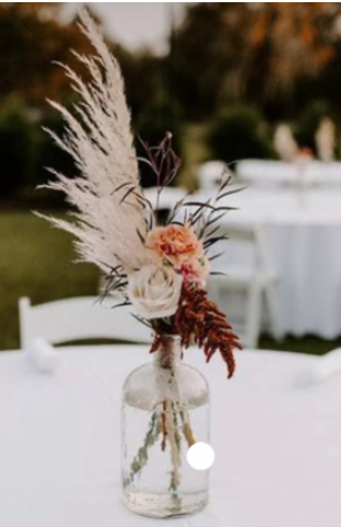 Small Wedding < 50 guests 6 x Aisle vases with Pampas Grass and Eucalyptus 2 large Entrance boho arrangements with eucalyptus and palm leaves Welcome to our Wedding sign with decor 1 boho arrangement for backdrop (Venue supply the arch/backdrop) Bride / Groom chair decor 1 altar/table Boho floral arrangement 2 sides boho arrangement