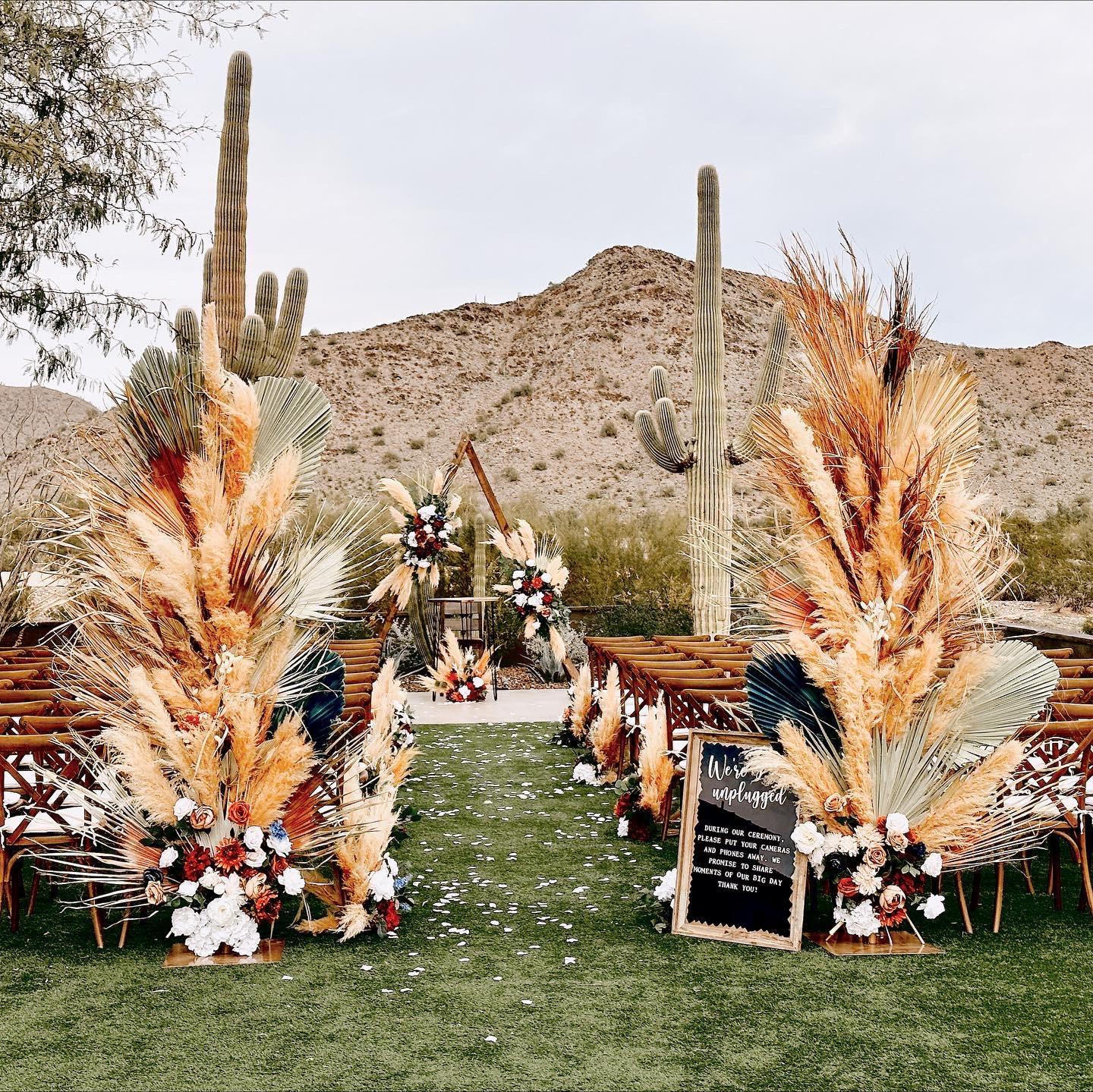 Good for Wedding (100 guests) 10 x Tall Aisle pampas bouquets with wedding colors and greenery 2 x Large Entrance pampas bouquets/ columns with greenery and wedding colors. Welcome to our Wedding sign with decor 1 backdrop with Boho arrangement White Aisle Petals or candles in cylinders 1 altar Boho floral arrangement **Package can be customized