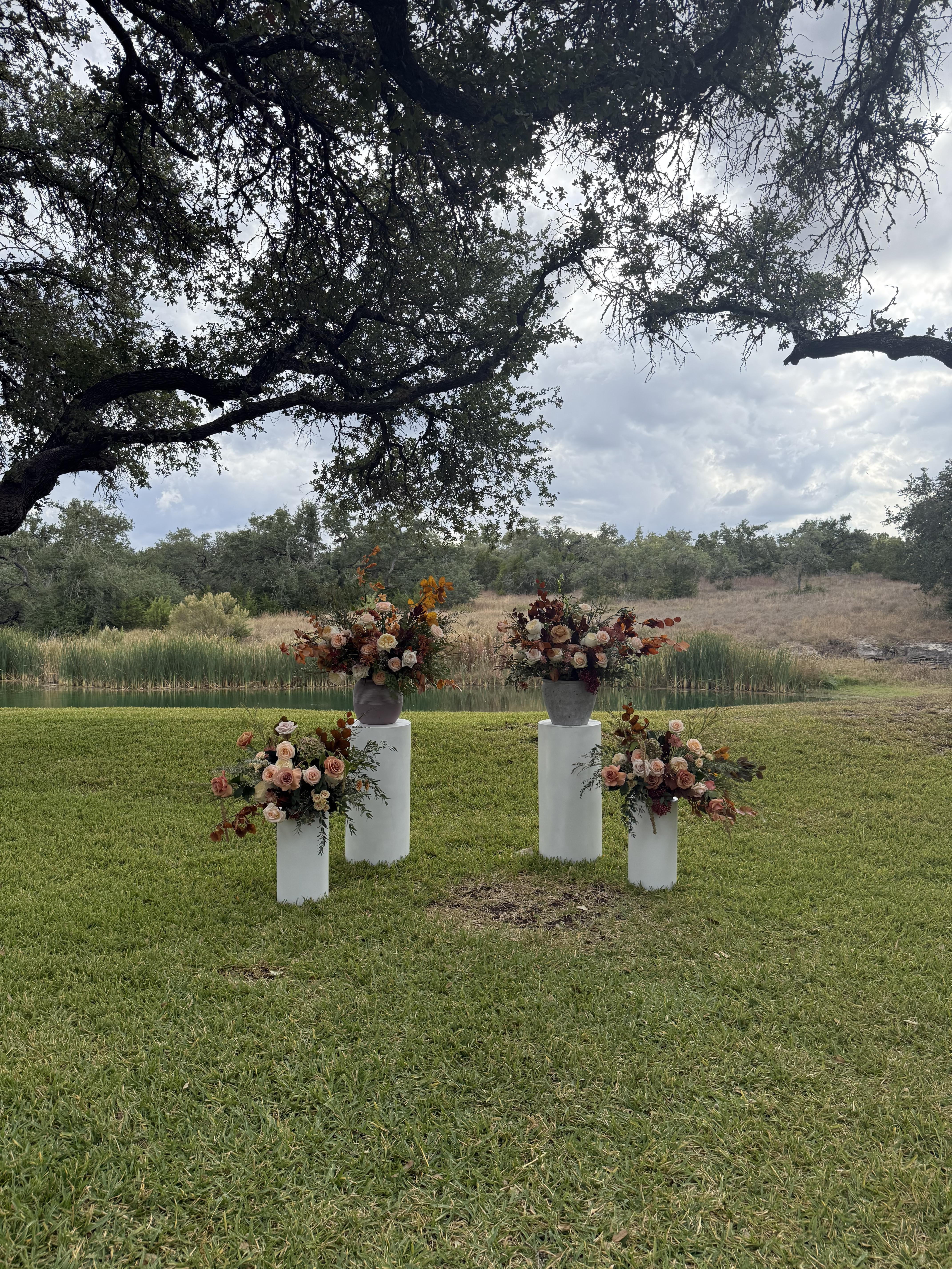 Personals Bridal bouquet 4 bridesmaids bouquets Groom boutonnière 4 groomsmen boutonnières Ceremony Welcome sign ground arrangement 3 arch clusters (your choice of placement) 2 aisle starter arrangements Reception 50 bud vases Cake blooms Photographer flat lay blooms