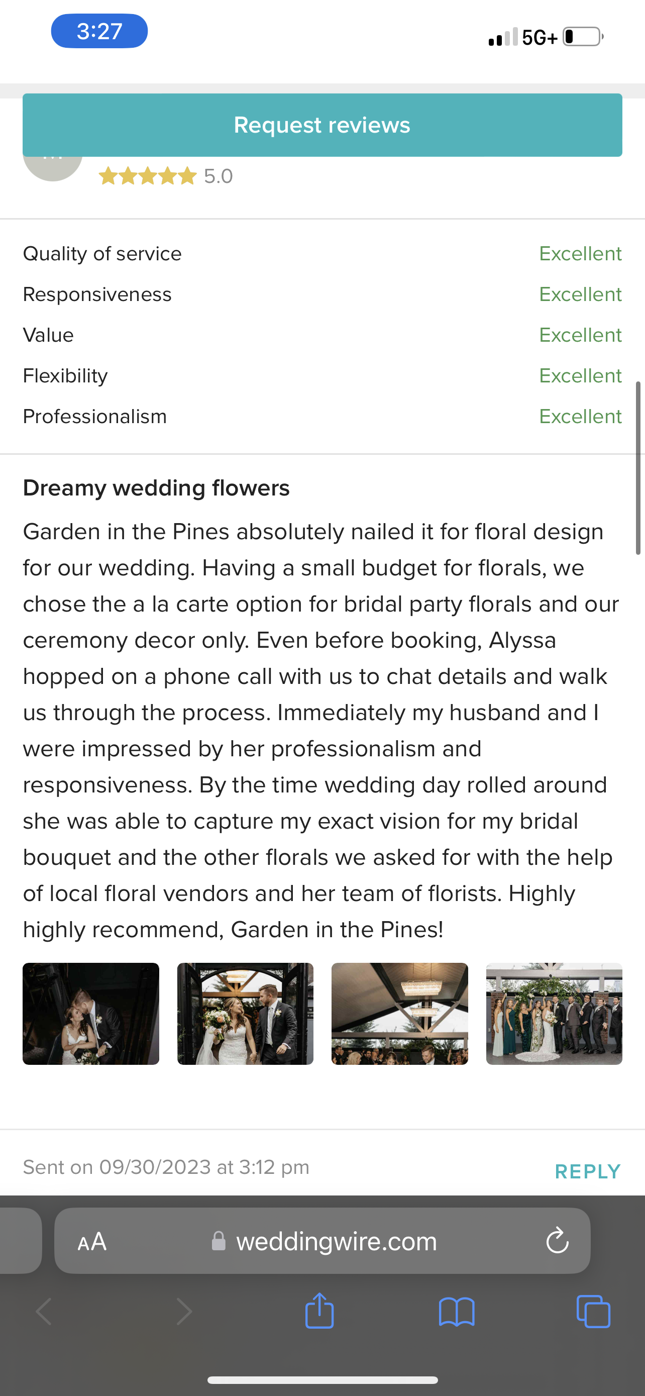 Alyssa was absolutely Amazing! She took all of my messages and conversations of my vision and she completely CRUSHED it! The bouquets, boutonnieres, centerpieces, ceremony arch were all exactly what I wanted. The color scheme and types of flowers were on point! They were all beautiful and every single detail was pure perfection! She was extremely responsive and was the most receptive vendor we had for our day! I cannot say enough about Garden in the Pines, RUN now and book them!