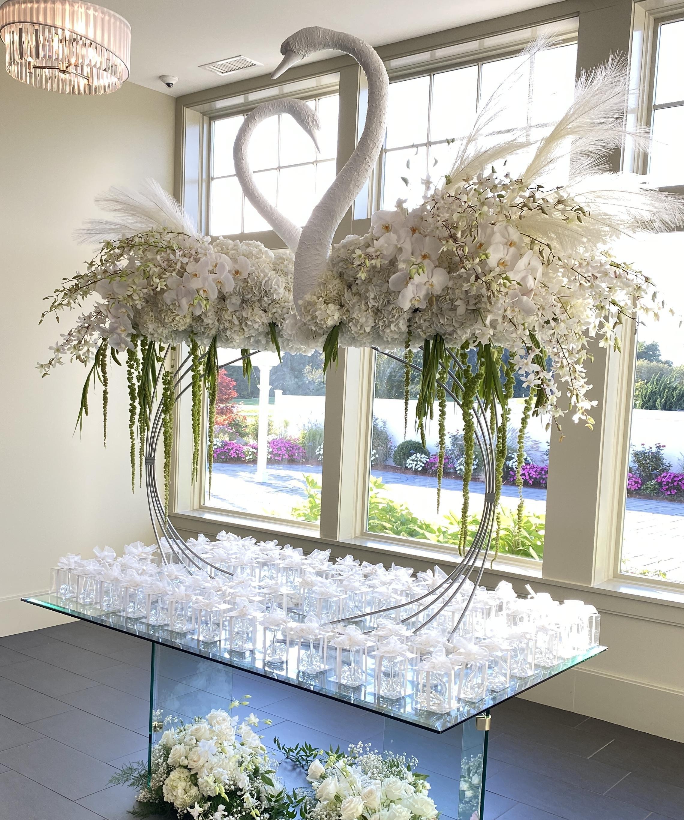 All designs are custom. Initial design consultation provided at no cost. We provide fresh floral decor and also silk floral installations. Many decor elements can be rented from us to be used with impressive florals . Decor may include candelabras, chandeliers, chuppah, floral chuppah, floral wall, custom photo zone, gold stands, pedestals, backdrop, ceiling floral installations, aisle decor silk or fresh flowers, candles, candleholders, floral dress, floral swans, custom floral design ….plexiglass white circle wall with custom decal, props…..