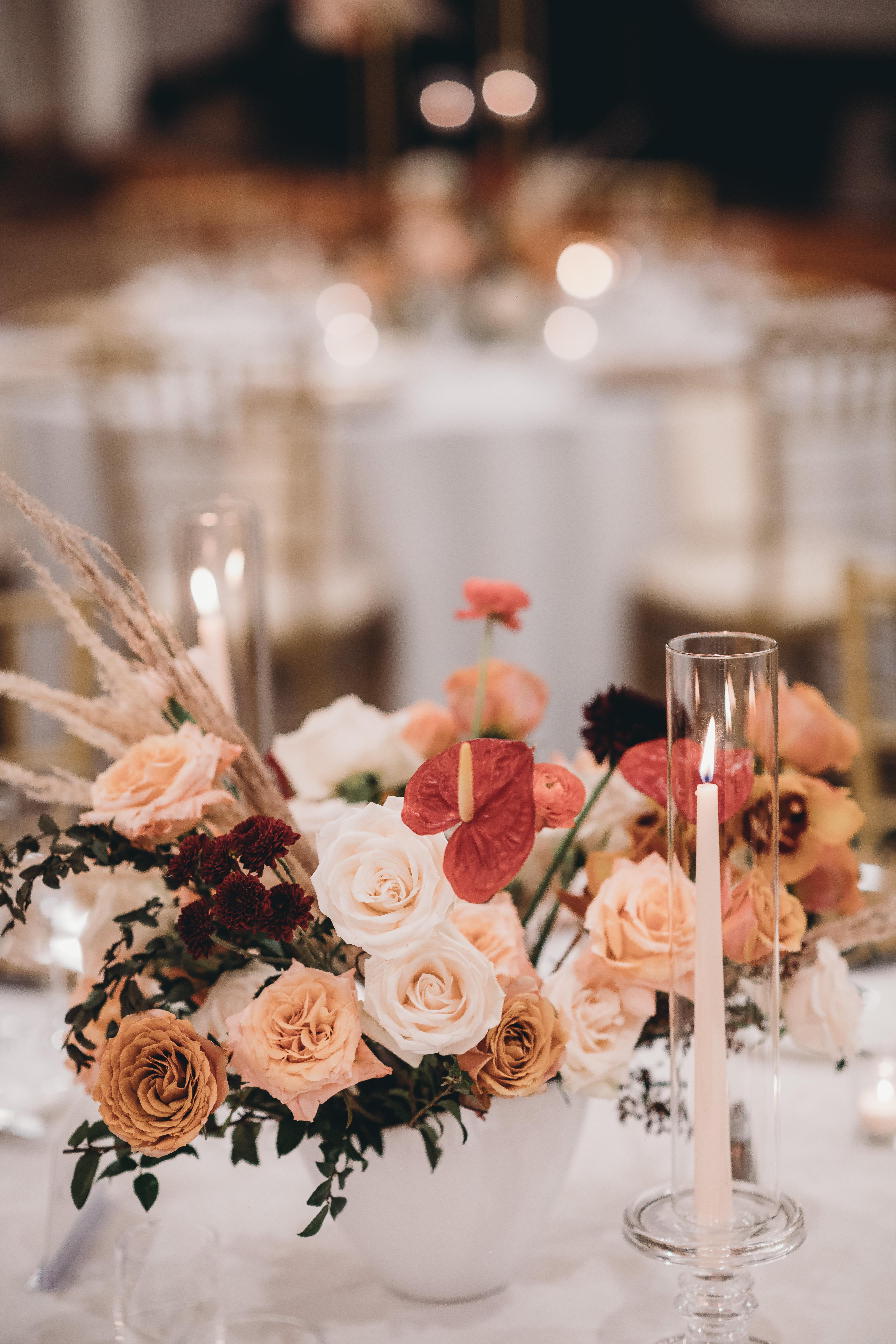 Full wedding styling and florals for including ceremony installation and florals, bridal party, reception centerpieces and candles. Styling is based on couple's wedding vision and color palette using KVE's signature trendy and elegant designs.