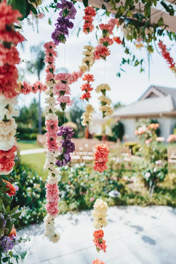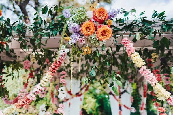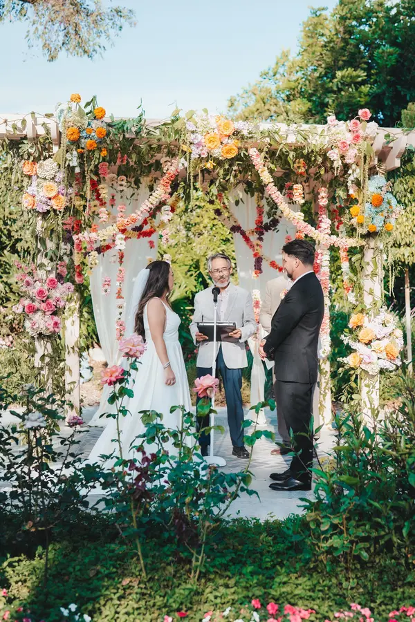 Wow! All I can really say about working with Maria Jose at Lovelia Floral is just wow! I've known Maria Jose for years, so when I had a couple still in need of a florist she was the first person I reached out to. Let me tell you, I've always known that she is attentive and detail oriented, and really likes to make sure that her clients have the full vision, but I was still blown away by the night and day difference between her and other florists I talked to. She didn't just ask for table count, centerpiece type, and color palette like so many others, she actually took the time to understand what was important to the couple and their wedding day. This couple was getting married in Camarillo, where the brides family has lived and worked for generations. Meanwhile, the grooms family is full of botanists and park rangers. This meant that it was super important to them that the flowers be from local farmers and be in-season flowers that would be able to tolerate the hot summer day. They wanted an experience for their guests, and one main show-stopping design with the pergola, and for the other smaller details to all play back into that main piece. They wanted something that felt fun, and natural, with a hint of whimsy and some soft elegance. Lovelia came up with the PERFECT design. From wrapping the pergola in greenery, to hanging flower chains that created curtains for guests to walk through and enter the wedding, the guest experience was immediately defined by this epic piece. That same pergola served as their alter, and the backdrop of their sweetheart table, and she made sure that it effortlessly transitioned through the evening, always being picture perfect. The bud vases were perfectly balanced, adding more whimsy while staying simple and elevated, and the piece to hide the ugly BBQ that would have otherwise been in every wedding photo was a true work of art. The ceremony and reception space were one and the same, with 8 tables needing to be fully set up in just an hour, and Maria Jose and her team made sure to stay and help make sure that ever table had the perfect arrangement and every candle was lit. Start to finish, Maria Jose made sure that we were always on the same page. She gave advice and input, she steered the couple back to center when they got a bit off course, she listed to their concerns and took their priorities into account at every step. I will always always always refer every couple I can to Lovelia.