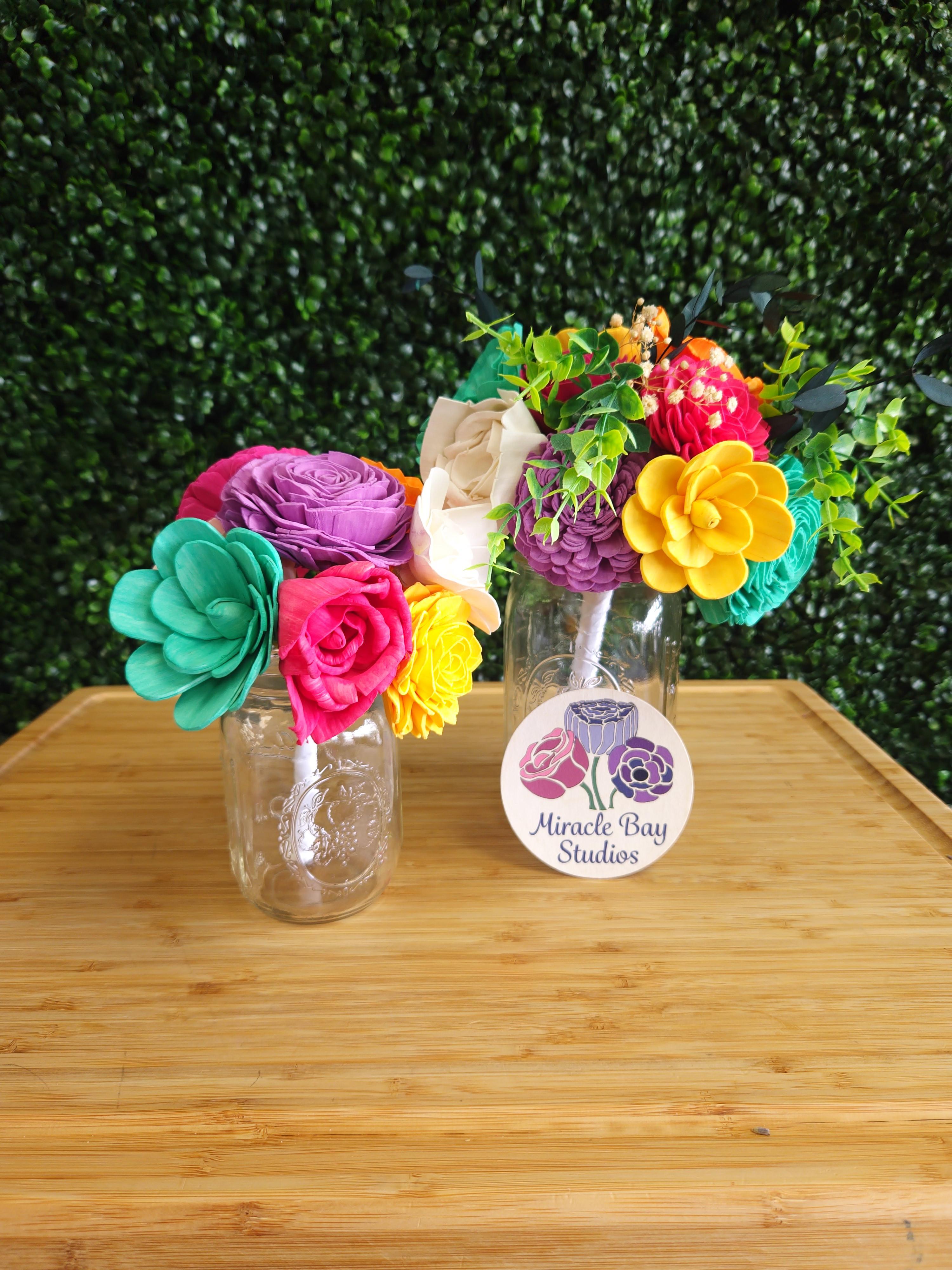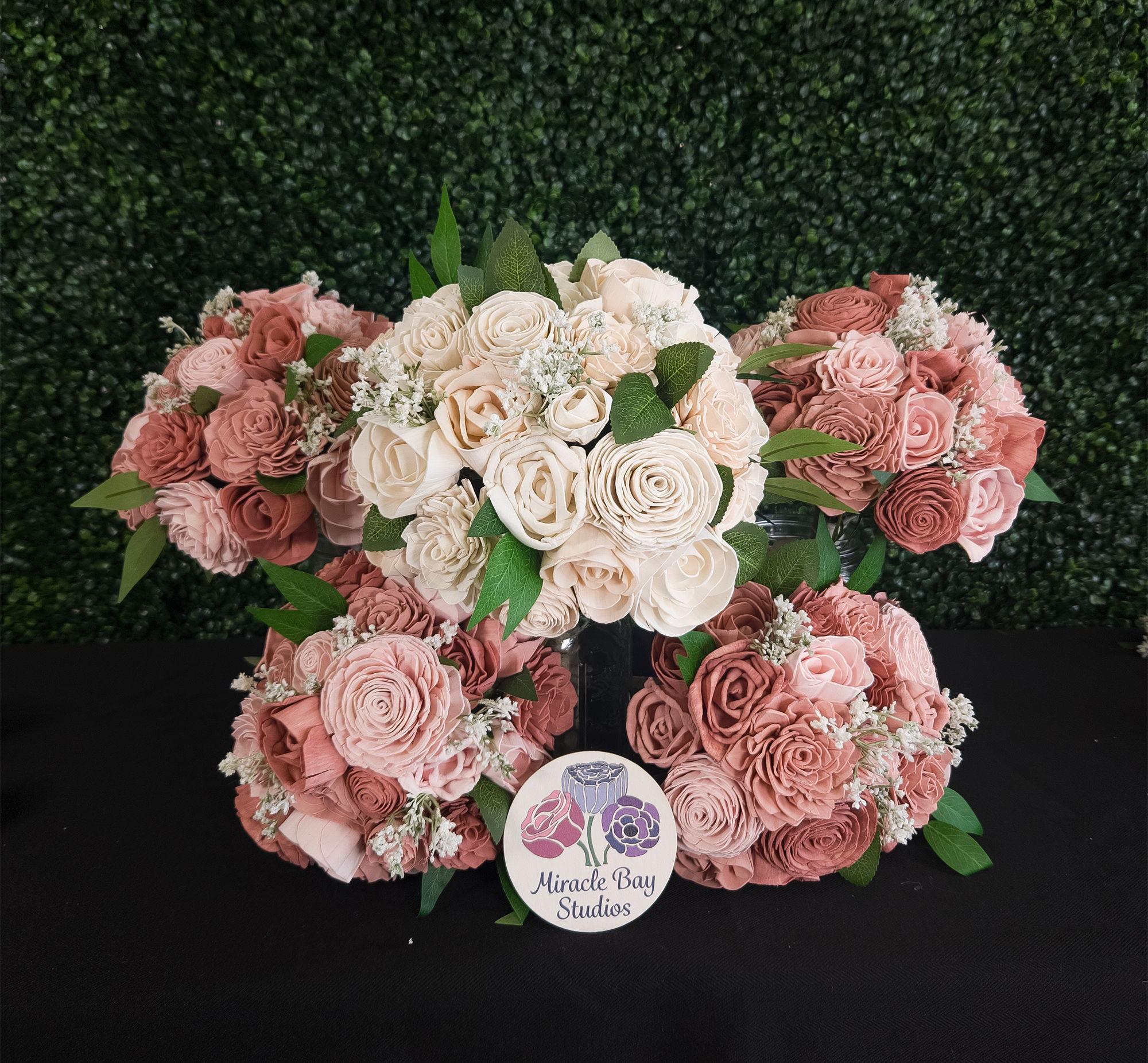 What sets Miracle Bay Studios apart is our handcrafted, long-lasting sola-wood florals. Unlike traditional flowers, our blooms stay perfect for months, hold up in any weather, and can be fully customized to match your colors and style. We combine artistry, quality, and practicality to create wedding florals and décor that look stunning in photos, fit your vision, and reduce stress — plus, they’re a keepsake you can enjoy long after your big day.