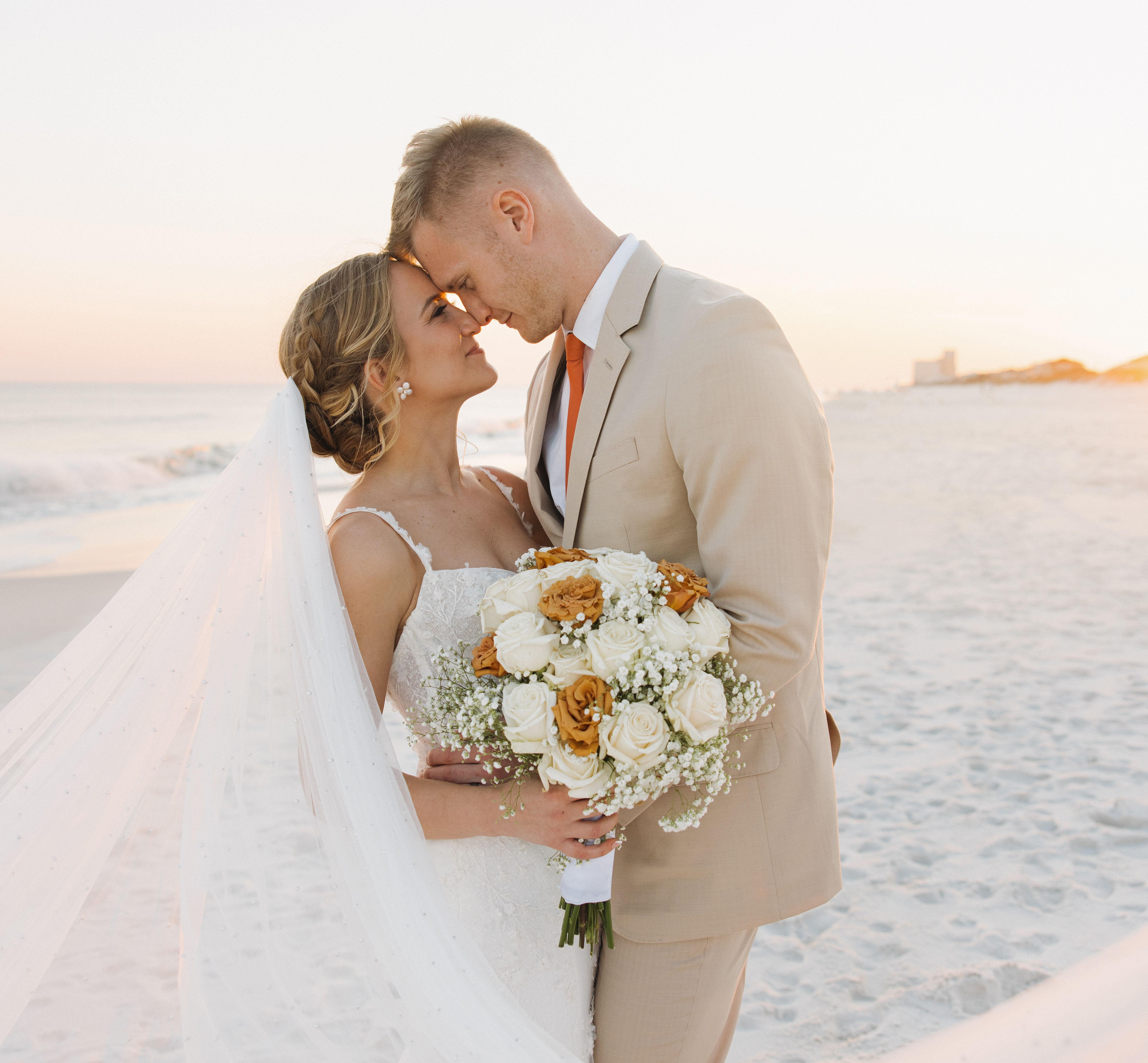 This includes 1 bridal bouquet, 1 boutonnière, and aisle decor. Arbor decor, additional bouquets or boutonnières can be added for additional fees. Travel is included for Pensacola or Pensacola beach. Further delivery will require a small travel fee.