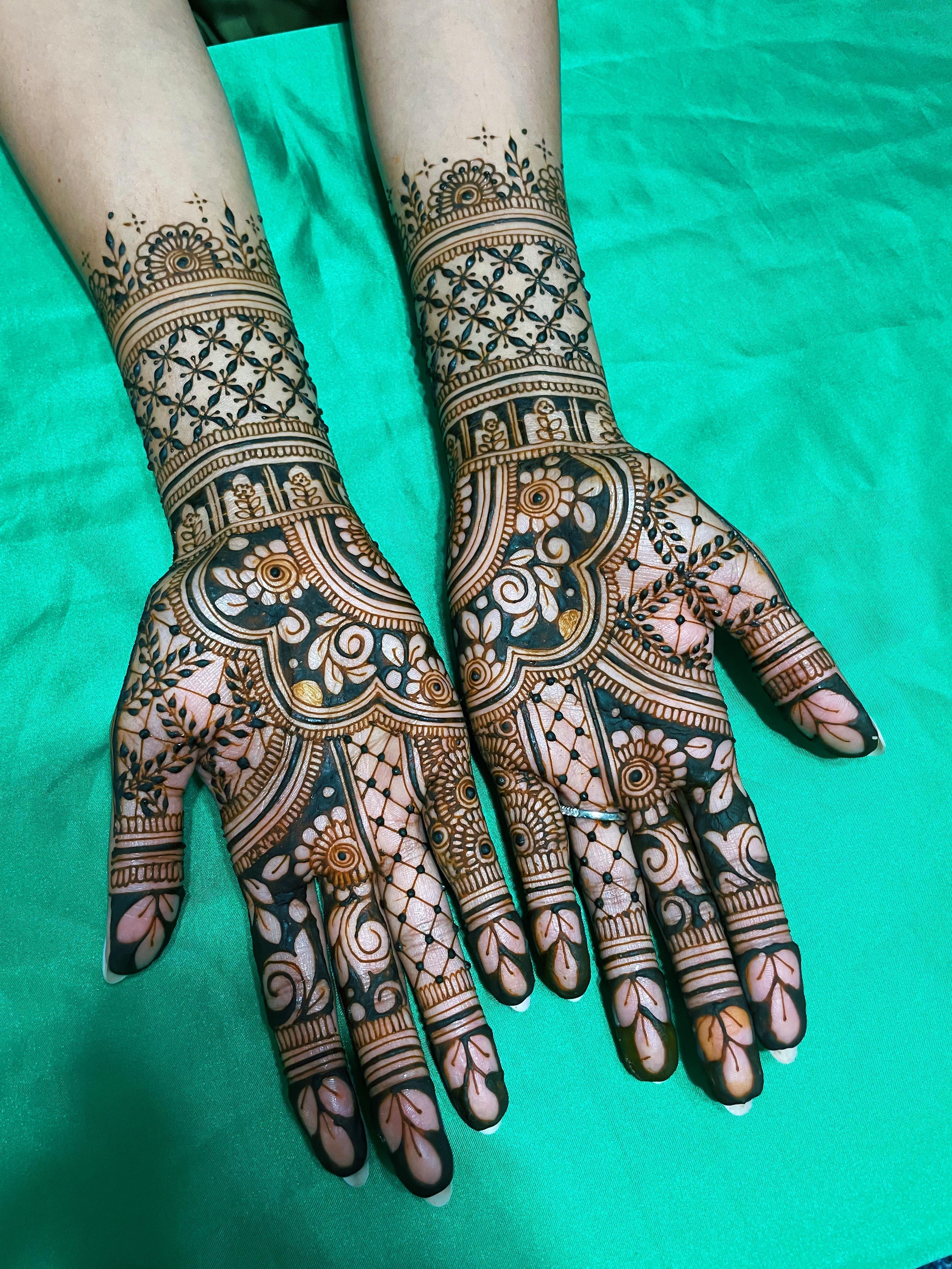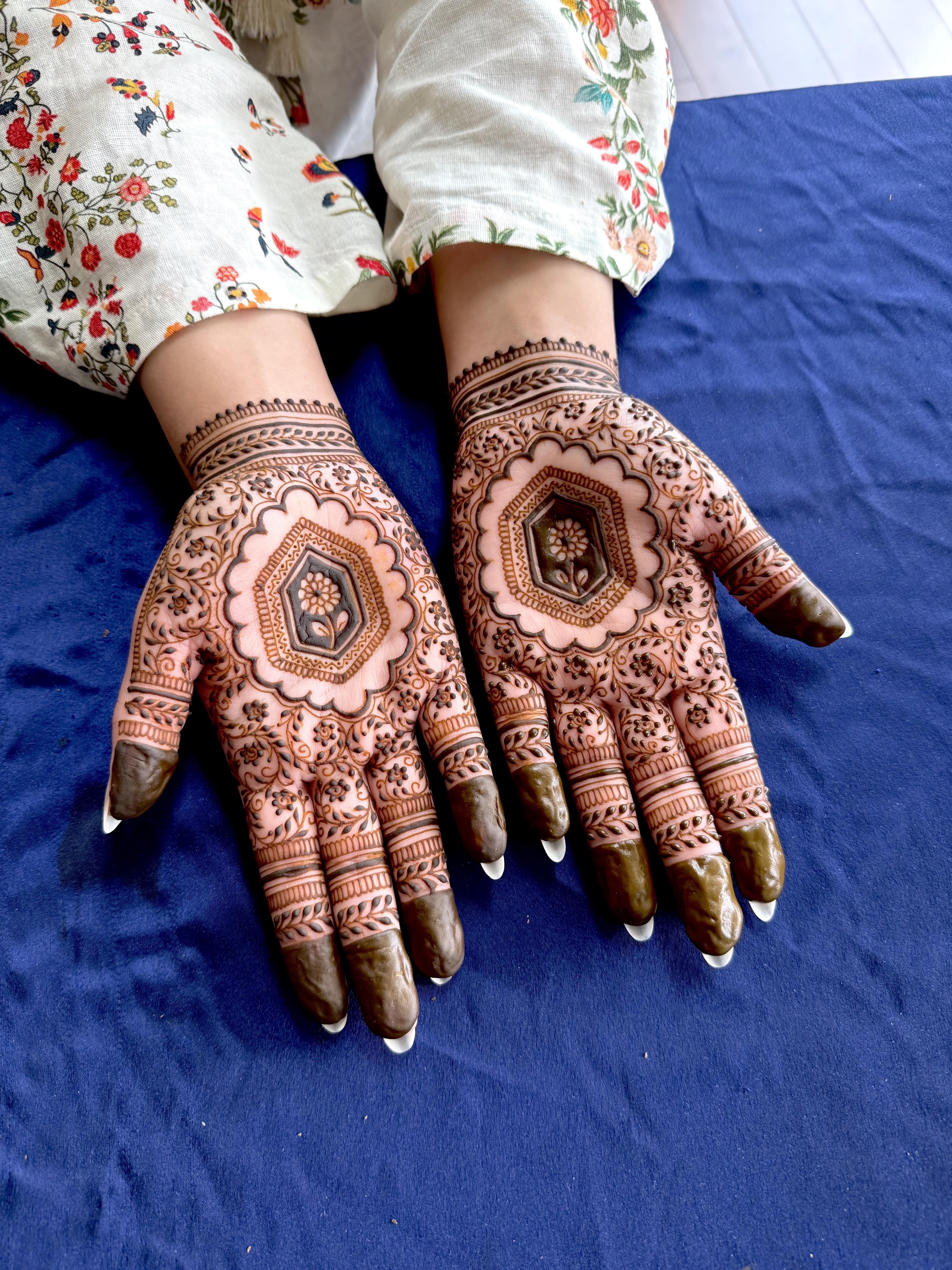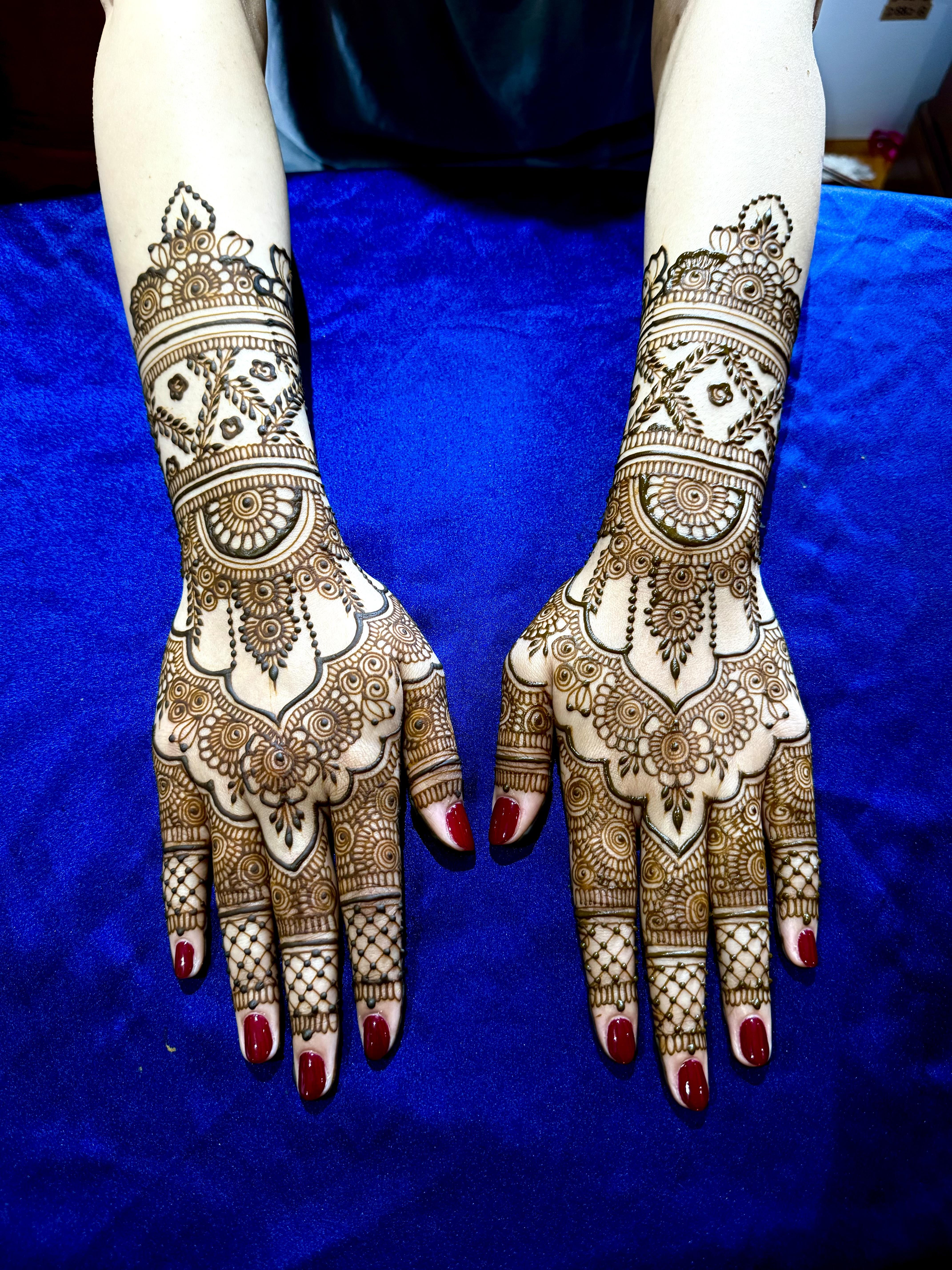 At Alfaaz Henna, we specialize in creating intricate, custom bridal henna designs that are as unique as each bride. As a former Design Student, I can transform traditional to modern, every design is meticulously crafted with the utmost attention to detail, ensuring your wedding day look is nothing short of stunning.