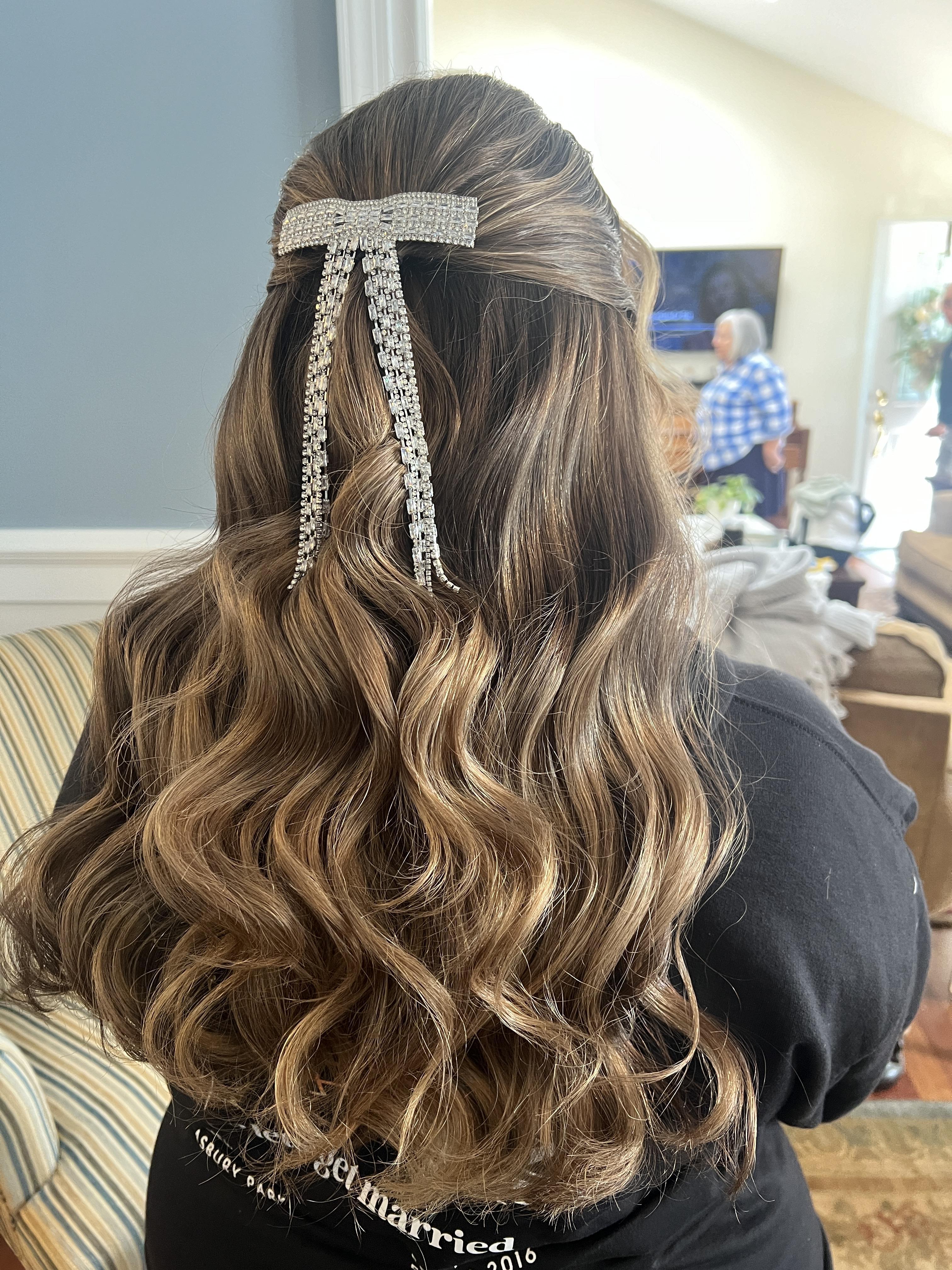 I selected Bewitched because I wanted a person that could work with my naturally wavy/curly hair. Stephanie has curly/wavy hair and loved working with it. I went with a side slightly up style. Greg did a beautiful job on not just my makeup but all my bridesmaids. Even when the first bridesmaid inexplicably showed up with wet hair, we were able to get the next one moving and easily adjust. They were pros at working in the bridal ready room in the Hilton in Camden. We had a great morning discussing Scandoval at length. They were wonderful.
