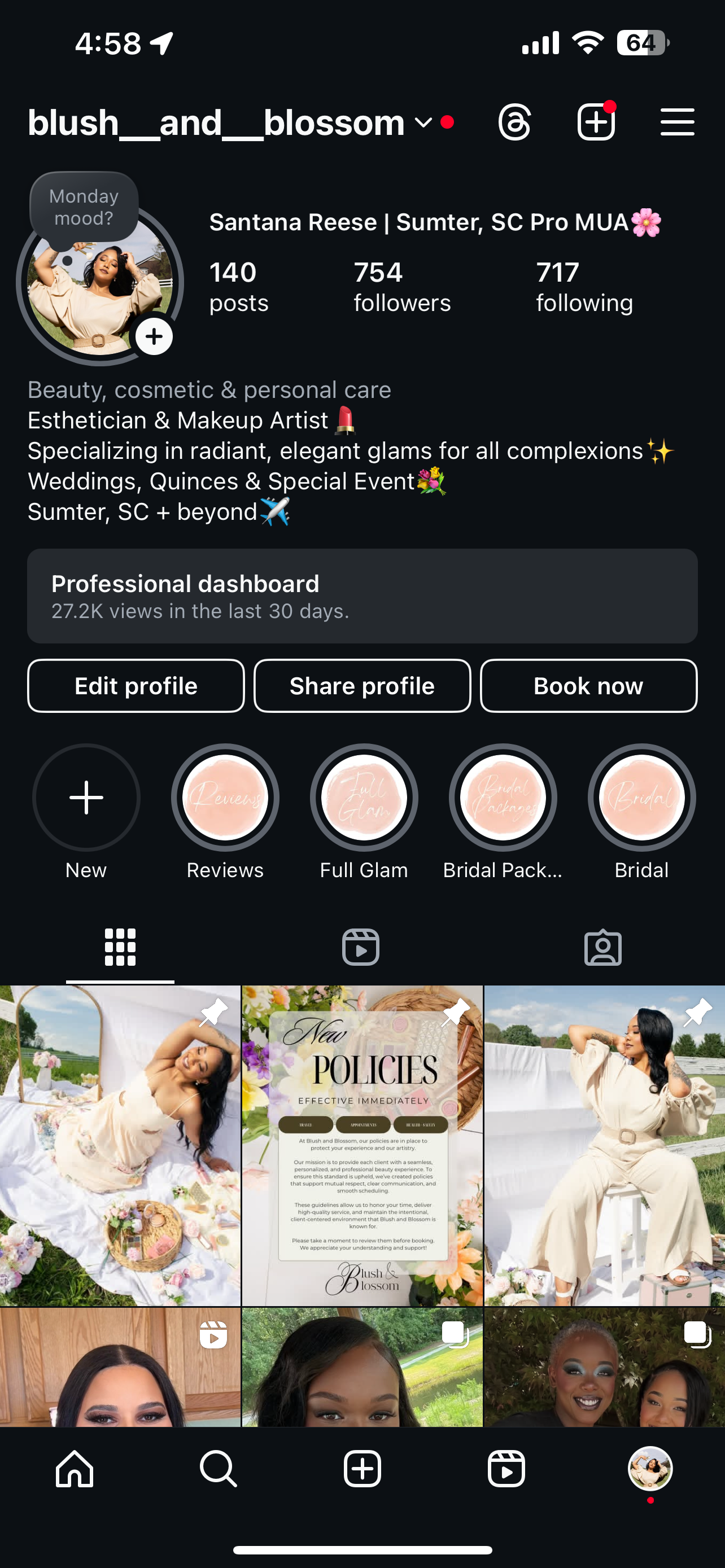 I'm Santana Reese, a certified esthetician speacializing in makeup. I’m based in Sumter, SC but I travel where ever my brushes take me. With a love for all things beauty, I believe that makeup is not just about looking good—it's about feeling confident and empowered. I focus on creating looks that enhance your natural beauty for any occasion. I take pride in my ability to cater to different styles and preferences, making each experience personal and memorable. I specialize in working with clients of all complexions, ages, and skin conditions. Here at Blush and Blossom, every look blossoms I can’t wait to see you bloom!