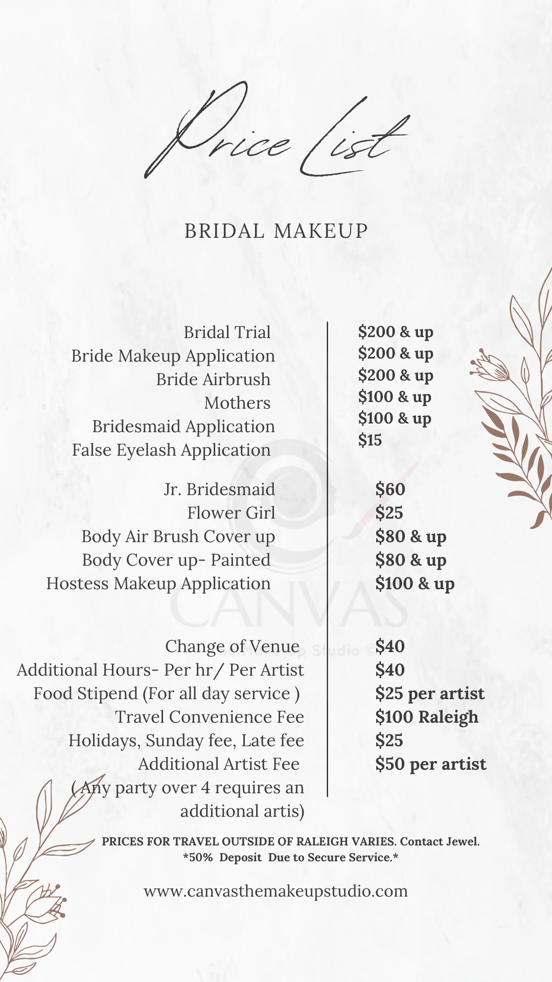 Canvas The Makeup Studio was an absolute pleasure to work with for my wedding day. From our very first interaction, they were incredibly organized and punctual, creating a detailed itinerary to ensure everything ran smoothly. On the day of, their team of talented artists delivered flawless, perfect makeup that looked beautiful and lasted all day and night. They were so attentive, constantly checking in to make sure I was happy with how everything looked, and even took the time to touch up my bridal party throughout the wedding. I cannot recommend Canvas The Makeup Studio highly enough - they truly helped make our special day even more perfect.