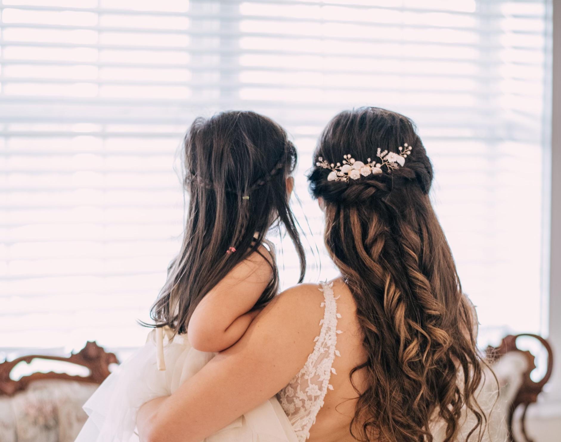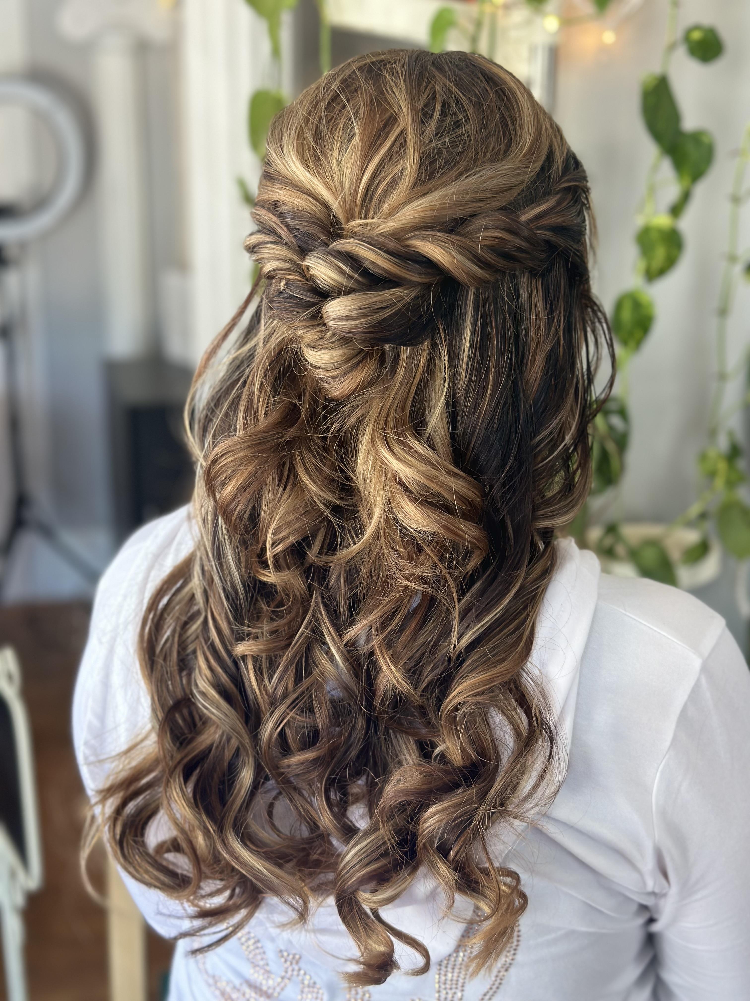 - Hair styling in updo, half up or down