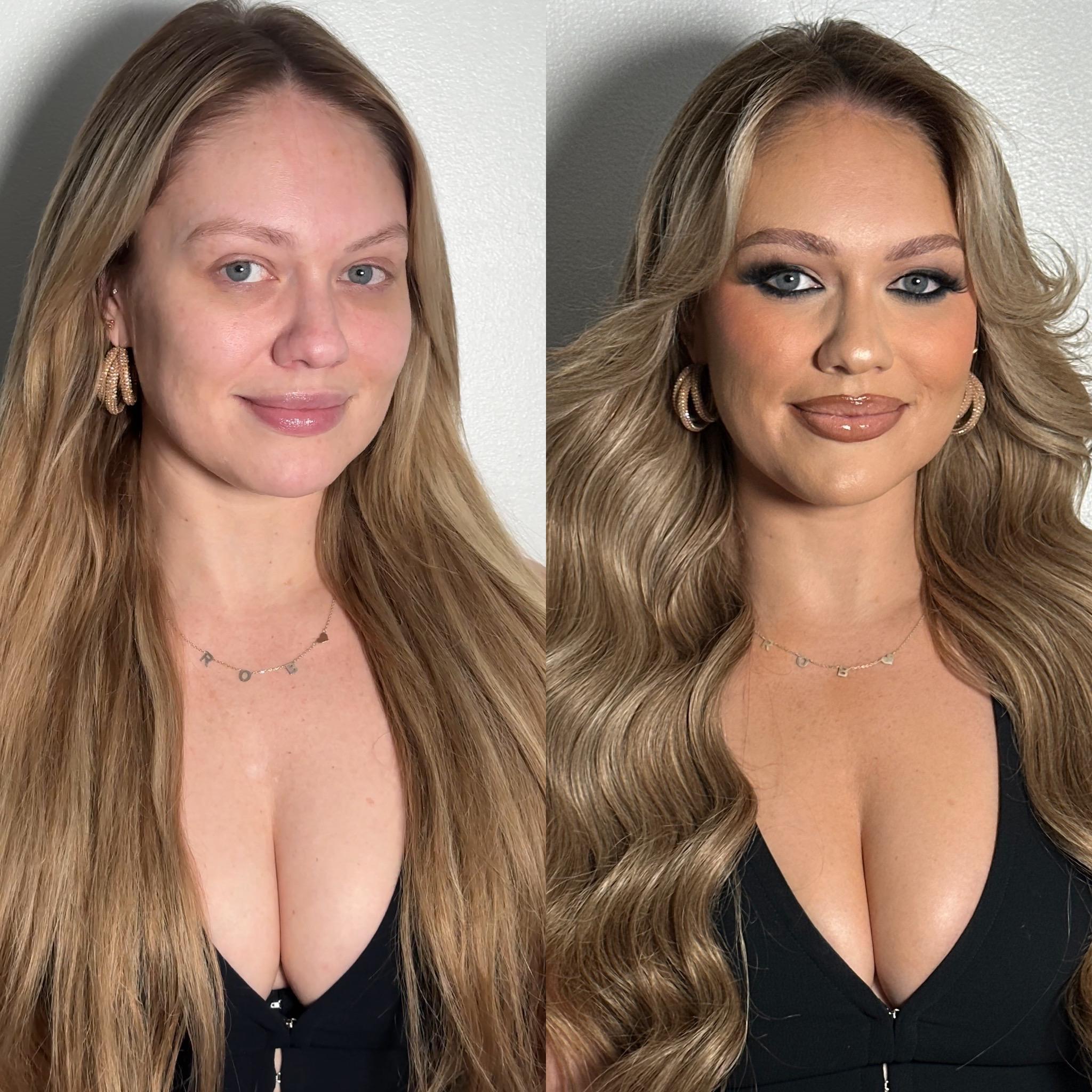 Full face including complimentary regular lashes, a simple hair style, and travel to desired location included. Any extensions added is an extra fee. Ask for in studio pricing if needed. (2h).