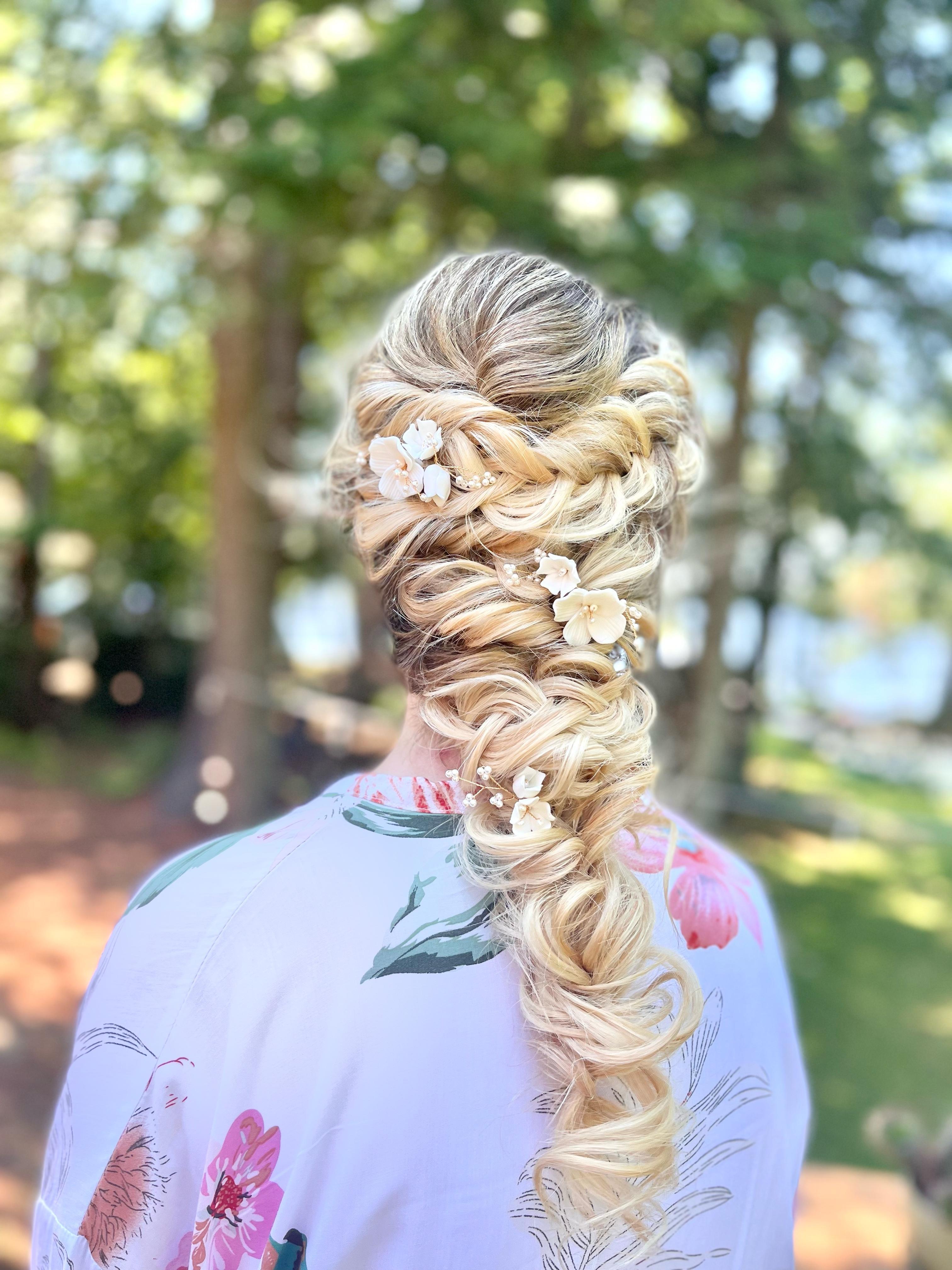 I cannot say enough amazing things about my wedding hair stylist! From the moment of my trial, I knew I was in the best hands. She is incredibly talented, detail-oriented, and truly passionate about her work. I fell in love with my hair at the trial — it was absolutely perfected. She took thorough notes and pictures, asked all the right (and important!) questions — even ones I hadn’t thought of — just to ensure everything would be exactly how I envisioned it on the big day. On the wedding day, she styled not only my hair, but also my mom, bonus mom, mother-in-law, nana, family friend, matron of honor, and all my bridesmaids — and every single person looked stunning. Each style was beautifully tailored to the person, and lasted all day and night. She was organized, calm, and had such a lovely presence that made the getting-ready experience feel smooth and special. What truly blew me away was how she volunteered to stay a little later just so she could place the flowers in my hair once the florist arrived — going completely above and beyond. Her professionalism, humility, and extraordinary skill make her a total gem. I would hire her a million times over if I could. She helped make my wedding day even more magical, and I’m endlessly grateful.