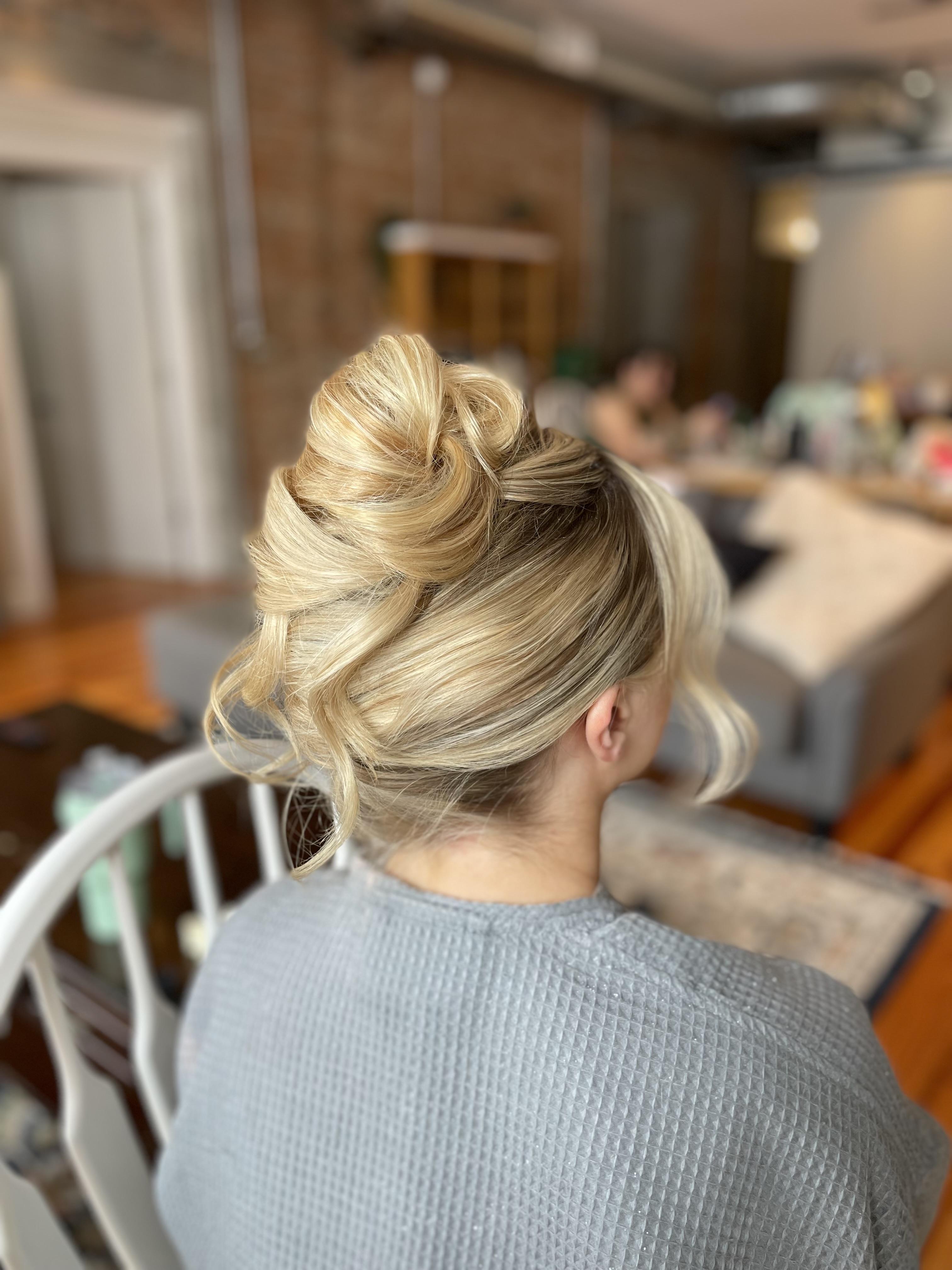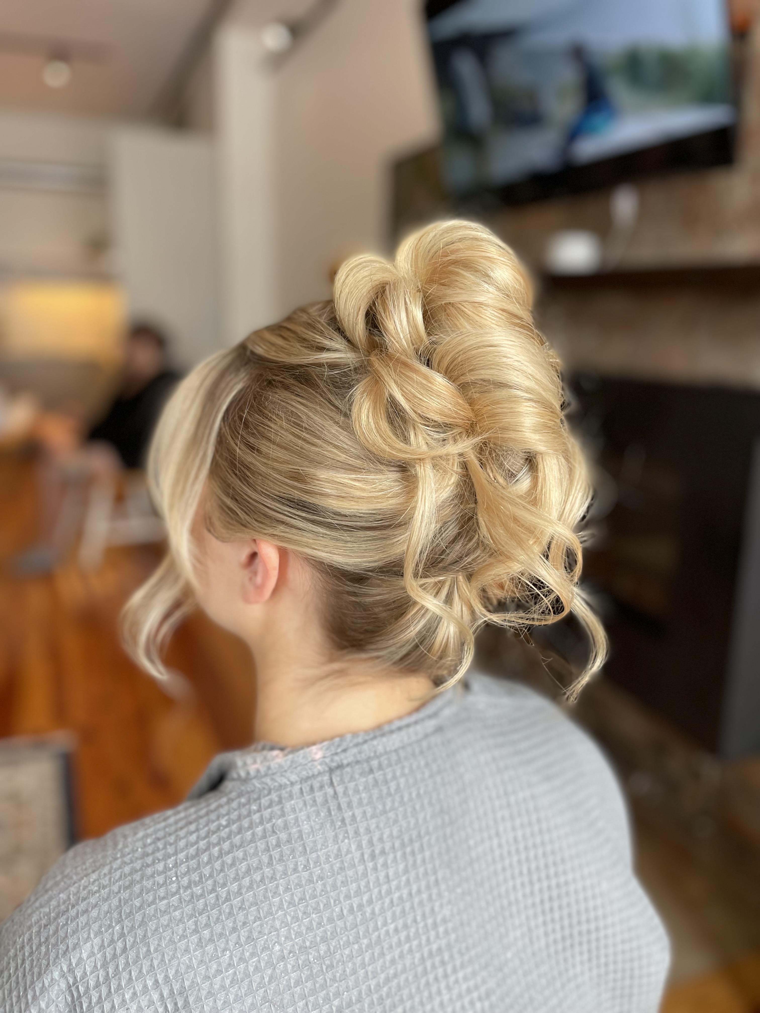 Here are things to consider. Do you want your hair all up, half up, or all down? What is the length and density of your hair? What is the integrity of your hair (is it damaged and cannot withstand a hot tool)? Does your hair hold curl? Will you be outside/what time of the year is it? It is very important to have an inspiration picture prepared before you sit down in the chair. It is crucial for artists to stay on time. Remember pictures are the inspiration, not the goal. The artists will always do what best for your hair.