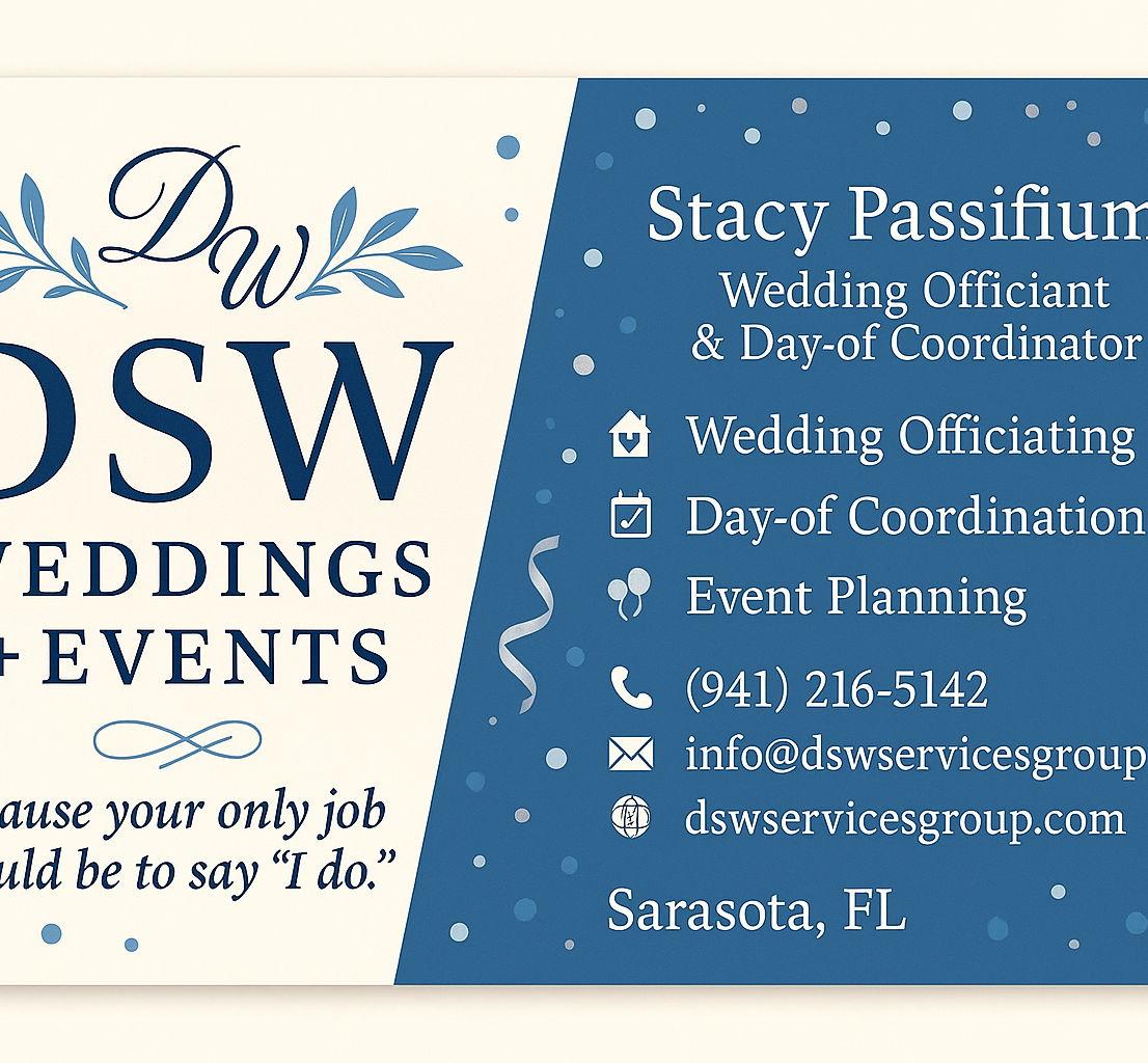 We were thrilled with the services provided by DSW Services Group for our wedding ceremony. Stacy, our officiant, had an effective and easy-going communication style that made us feel comfortable throughout the planning process. She brought a creative and unique approach that truly captured the essence of our special day. Stacy listened to our vision and ideas, then expertly crafted a personalized ceremony that was high-quality and meaningful. We highly recommend DSW Services Group to any couple looking for an officiant who will bring their dreams to life.