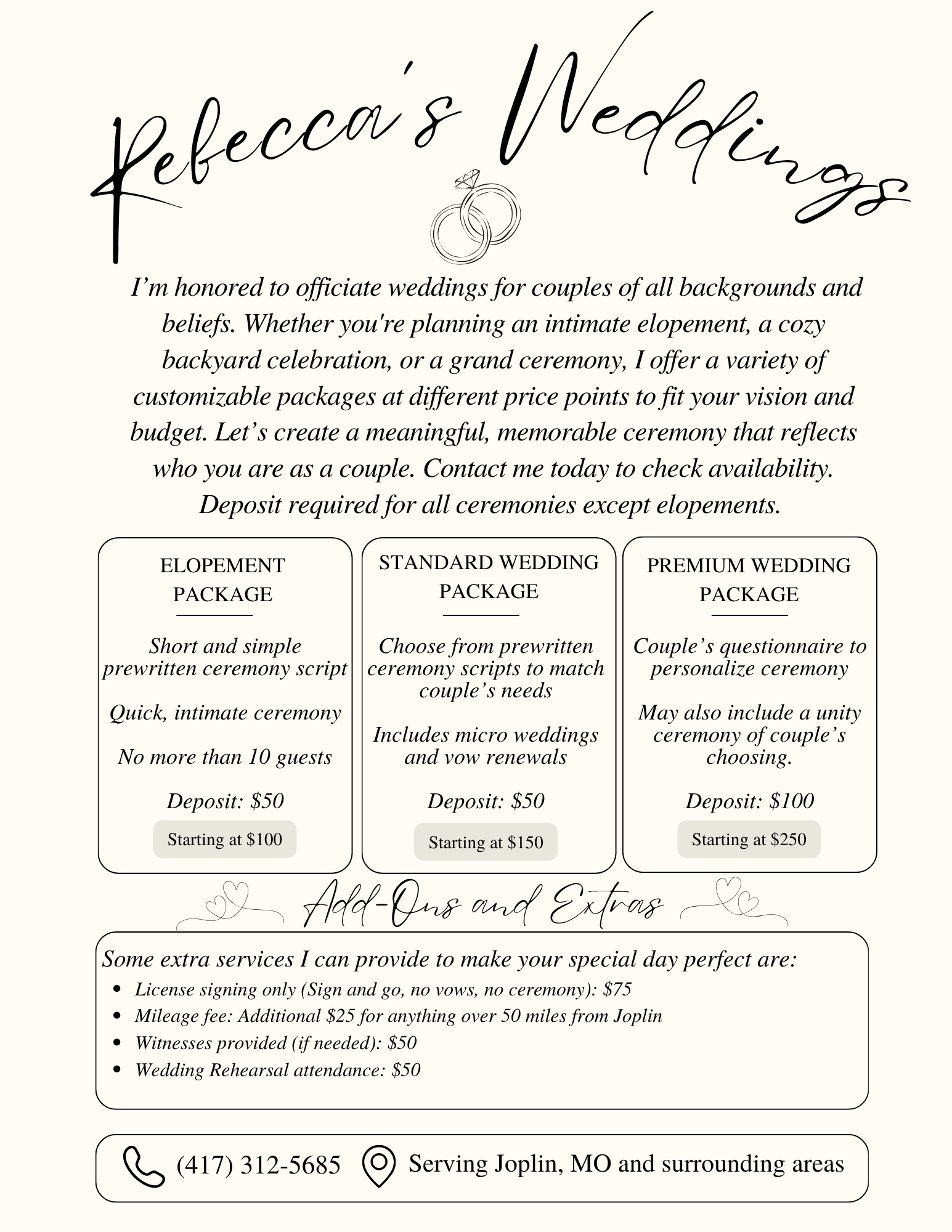 $150 Choose from prewritten ceremony scripts to match couple’s needs Includes micro weddings and vow renewals Deposit: $50