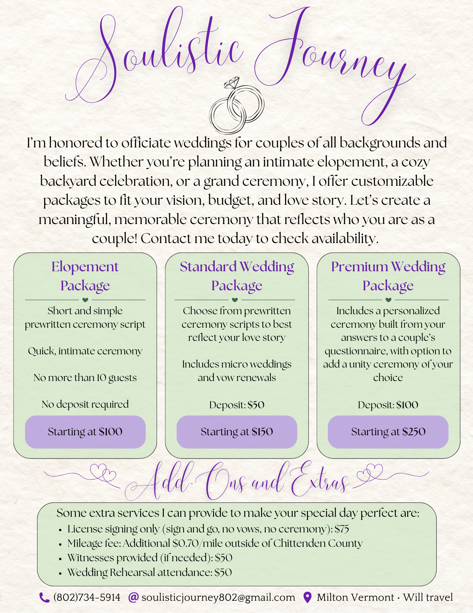 I’m a born and raised Vermont native with a genuine love for love and the care that goes into every wedding. Since becoming ordained in 2021, I’ve helped couples of all backgrounds celebrate their unique connection through personalized, heartfelt ceremonies. Whether your celebration is an intimate mountaintop elopement or a joyful gathering surrounded by loved ones, I’ll guide you through every step with warmth, clear communication, and genuine care. Together, we’ll create a ceremony that feels authentic, meaningful, and completely your own.