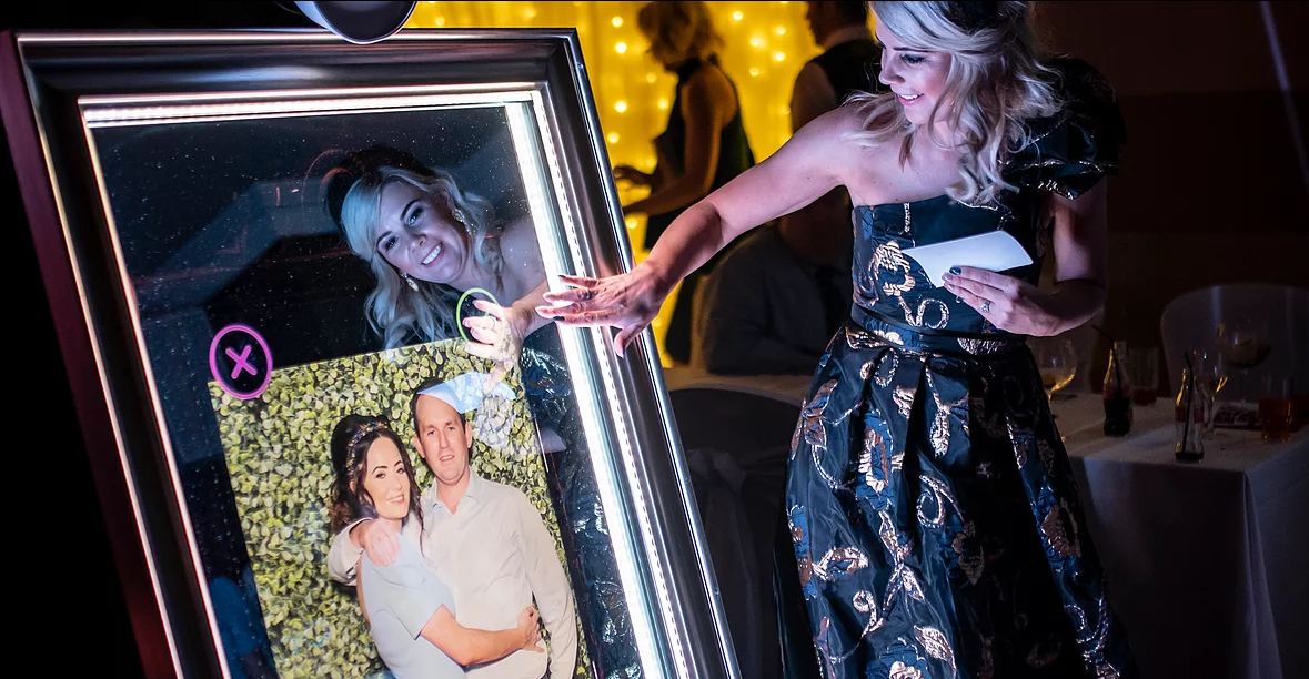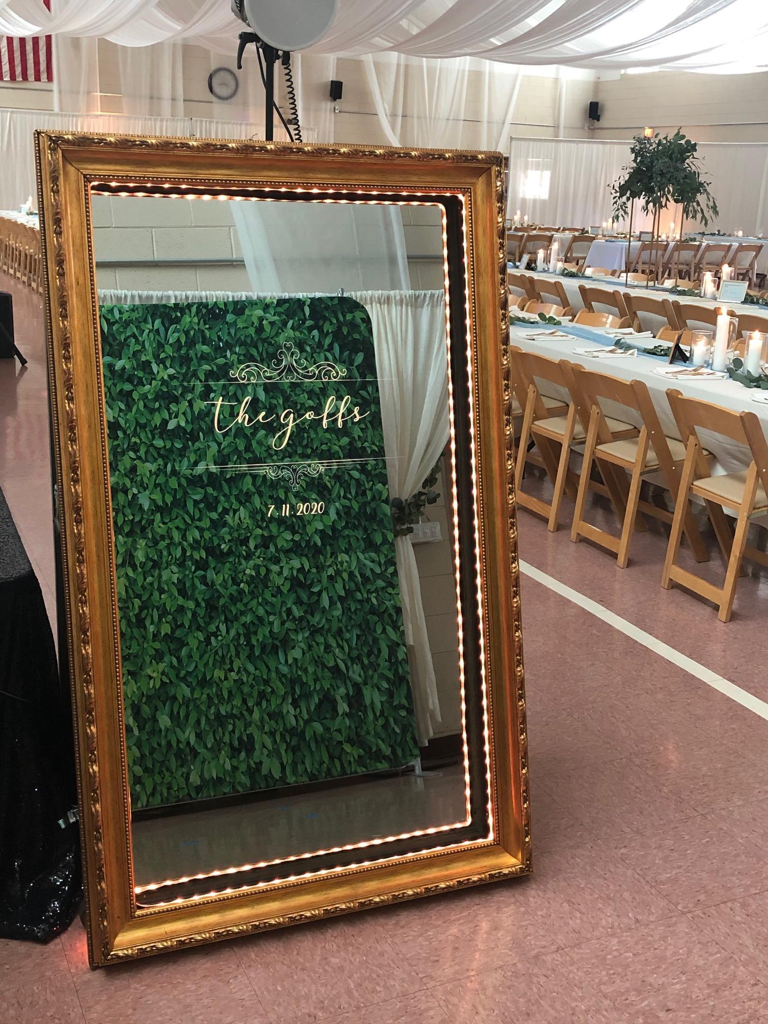 We customize all aspects of our photo booths. With the Mirror Photo Booth, aka the "Magic Mirror," we can customize the start screen animation to say you and your fiance's name, date, and anything else you desire. It can be designed to match your venue or your wedding style. The Mirror Photo Booth has the option of a gold or silver frame. Both booths have a variety of optional backdrops to choose from. The creative designs of our photo template is something we brag about. We use Photoshop, and work closely with you so that the photo template is perfect and unique!