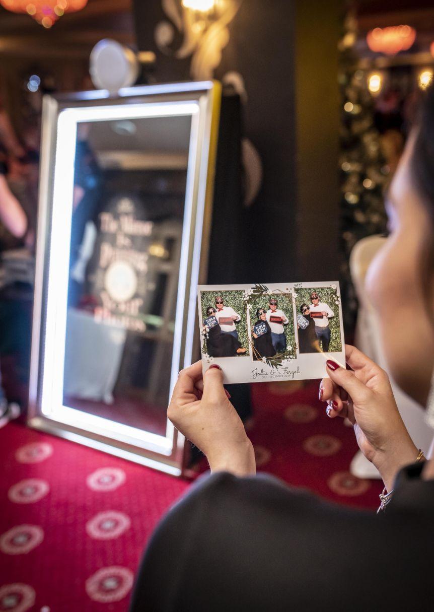 Let your guests experience a glamorous photo booth at your wedding. Our full length interactive mirror definitely gives that wow factor. We customize the start screen with your names and date which is surrounded by an elegant gold or silver frame. The mirror gives your guests the ability to print a keepsake from your wedding and text the pictures to their phones. We also create an album on site for you to take home the night of. Couples love to use the album as a guest book!