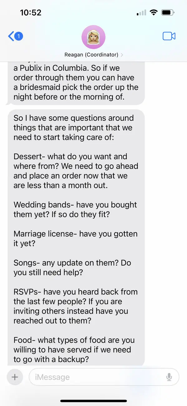 Porter Planning Co. (Reagan) was an absolute pleasure to work with from start to finish. She went above and beyond as a true problem solver and she really talked me down off of some stressful events. Reagan made me feel more confident and secure with how the wedding would unfold. She did everything she could to help me through this process - including adjusting her own plans in order to work with my schedule and providing alternatives when I needed them. I didn't feel judged by her or pressured by her towards certain decisions - she was there to support me and to help everything come together. She was even there to hear me vent a little! I cannot recommend her enough! She's an amazingly hard worker and she is determined to help your wedding go smoothly. I've included an example of the texts she would send - so incredibly helpful!