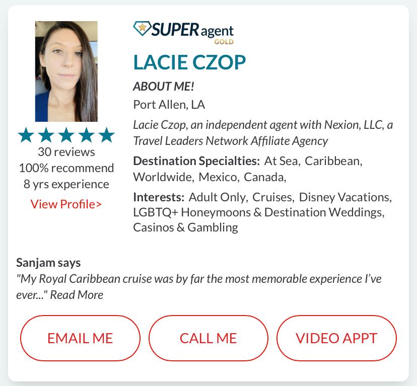 My service is complimentary! • ✨ Personal Touch: You’re not just booking a trip — you’re getting a travel bestie who listens, plans, and takes the stress off your shoulders. • 🌎 Exclusive Knowledge: You know the resorts, ships, and destinations inside-out, so clients don’t waste money on the wrong choice. • 💸 Value + Perks: You find deals, upgrades, and group rates they’d never see on Google. • 📲 Always Accessible: Clients can text/call you anytime instead of sitting on hold with a call center. • 💕 Relationship-Driven: You build connections — every client feels like family, not a transaction.