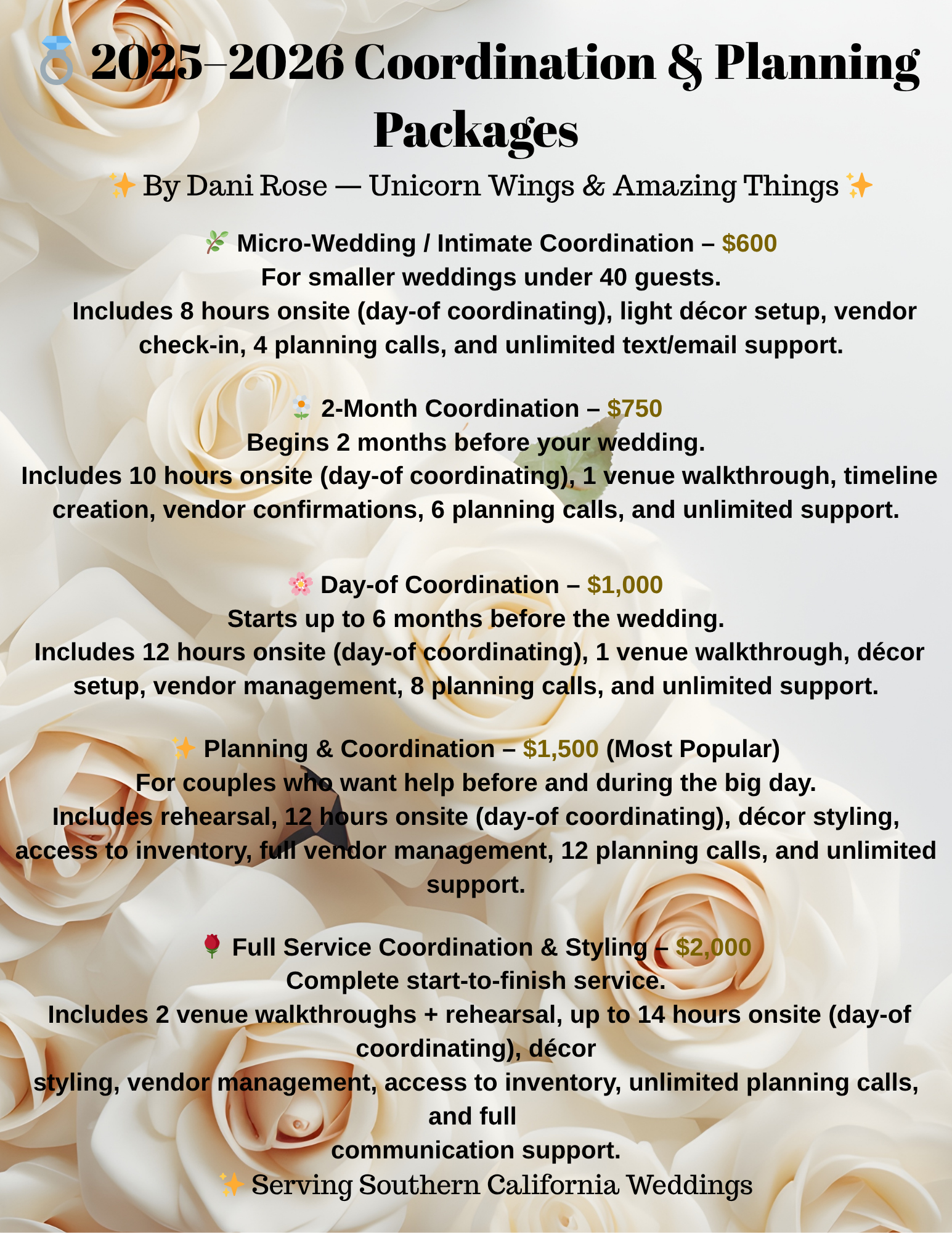 Wedding Planning Services Welcome to Unicorn Wings & Amazing Things! I’m Dani Rose, the Founder & Chief Magic Maker. With 17 years of experience, I’m passionate about turning your wedding dreams into reality. From rustic barn settings to tropical paradises, I bring your vision to life while keeping it eco-friendly and budget-conscious. I’m passionate about making all your wedding dreams come true without breaking the bank. My hands-on approach ensures every detail is perfect, creating a magical day that’s uniquely yours.