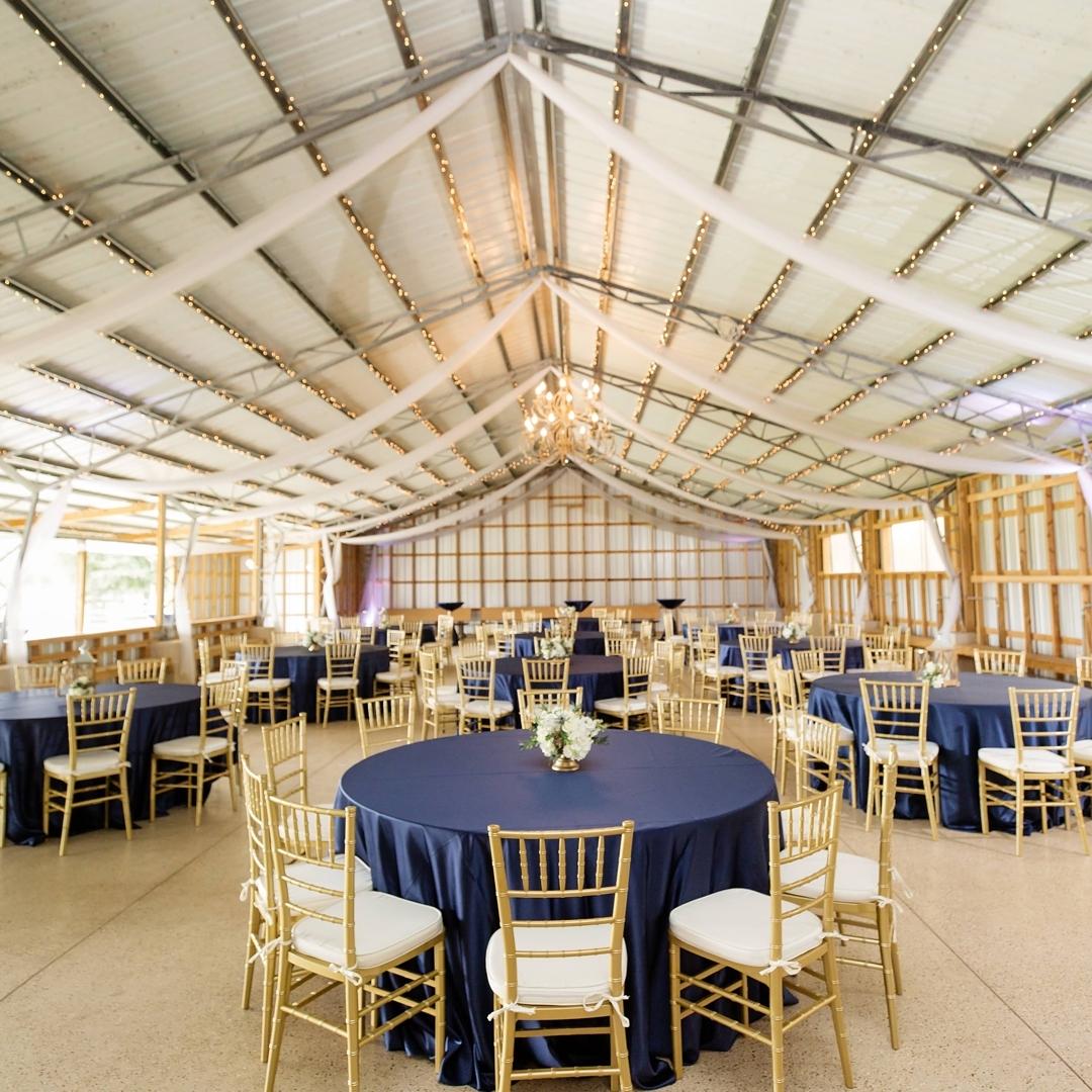 Our Big Barn is the ideal reception location as it offers the largest, covered footprint on the farm. The large, open floor plan features beautiful chandeliers, drapery, and a completely open side with views of the ceremony lawn and sunflower patches.
