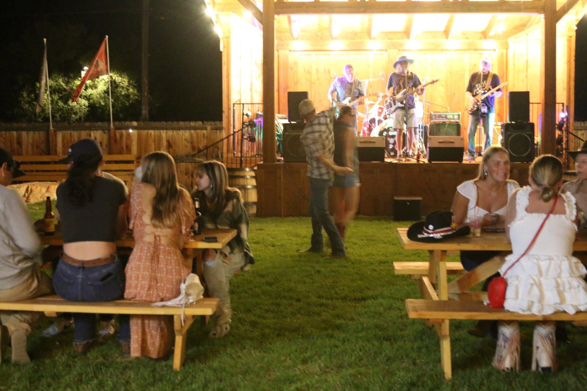 Raging Wood, fire, outdoor flaming heaters, backyard, bar, and music stage