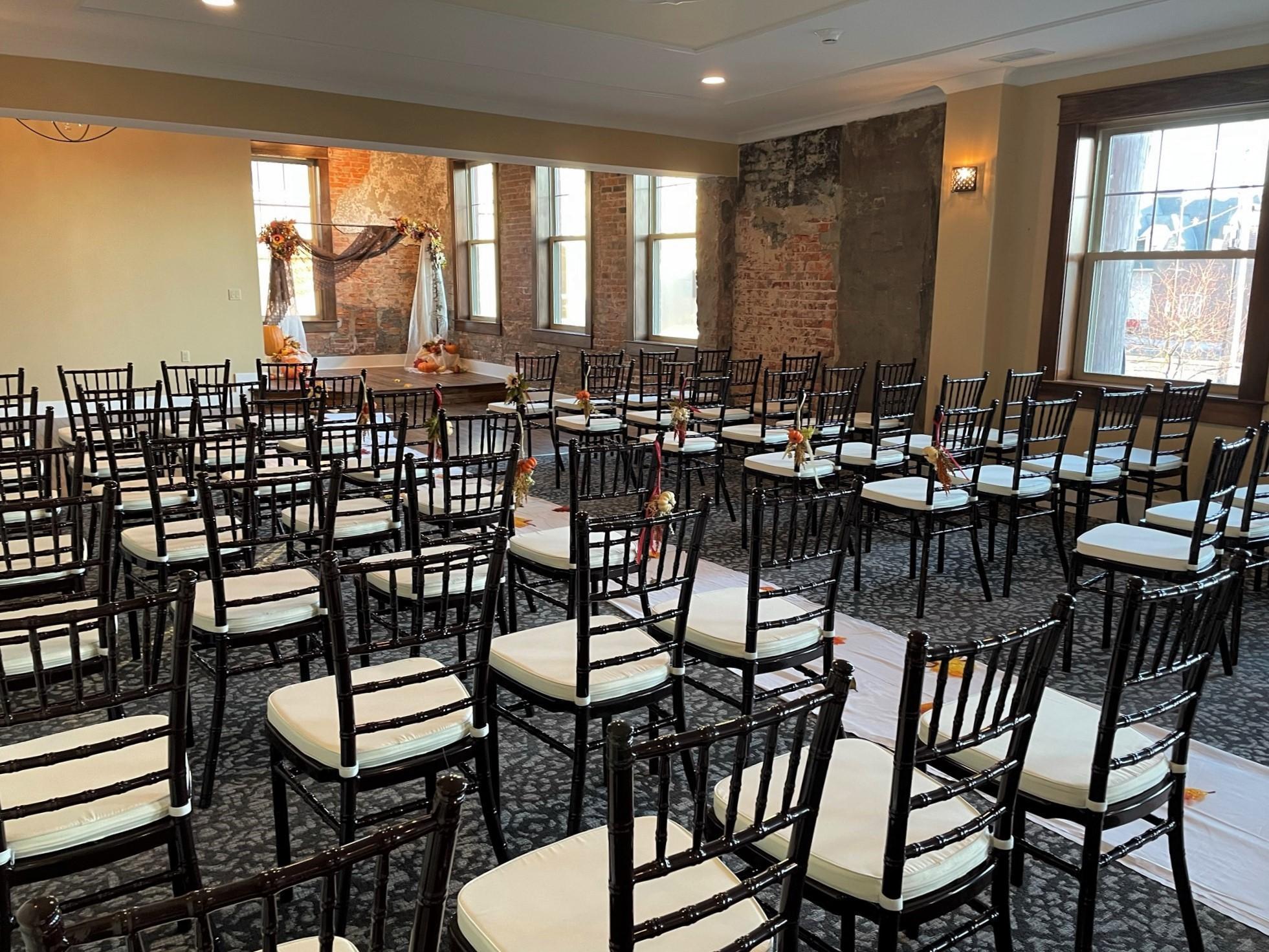 This space features exposed brick and large windows across the entire south wall. A small dance floor and stage highlights one corner and is perfect for wedding ceremonies. The room can also be set with round tables and chiavari chairs for events.