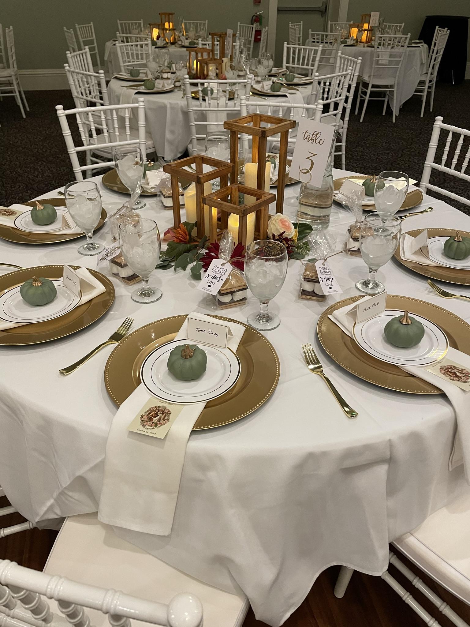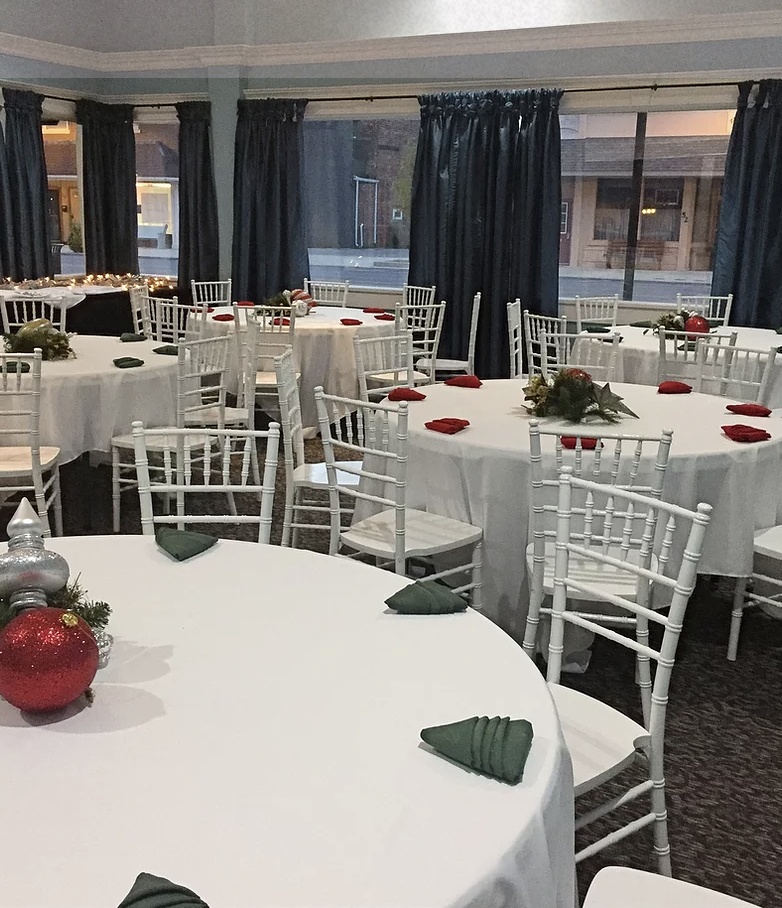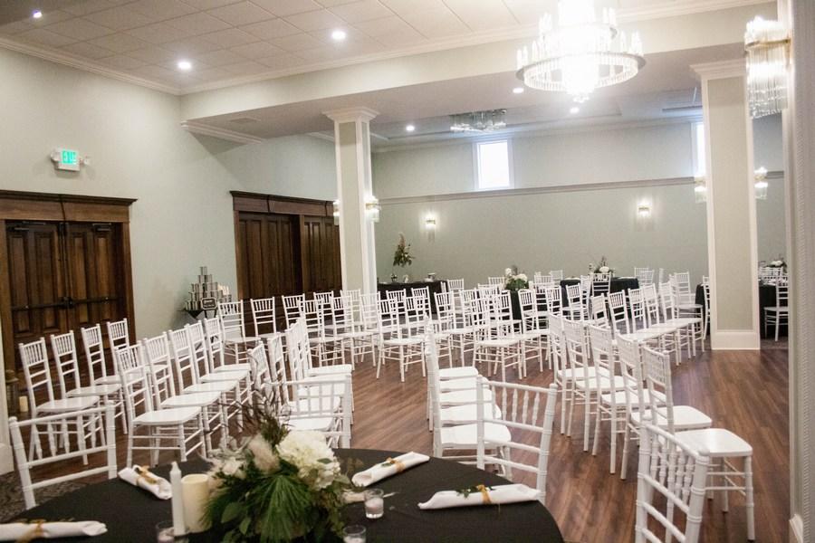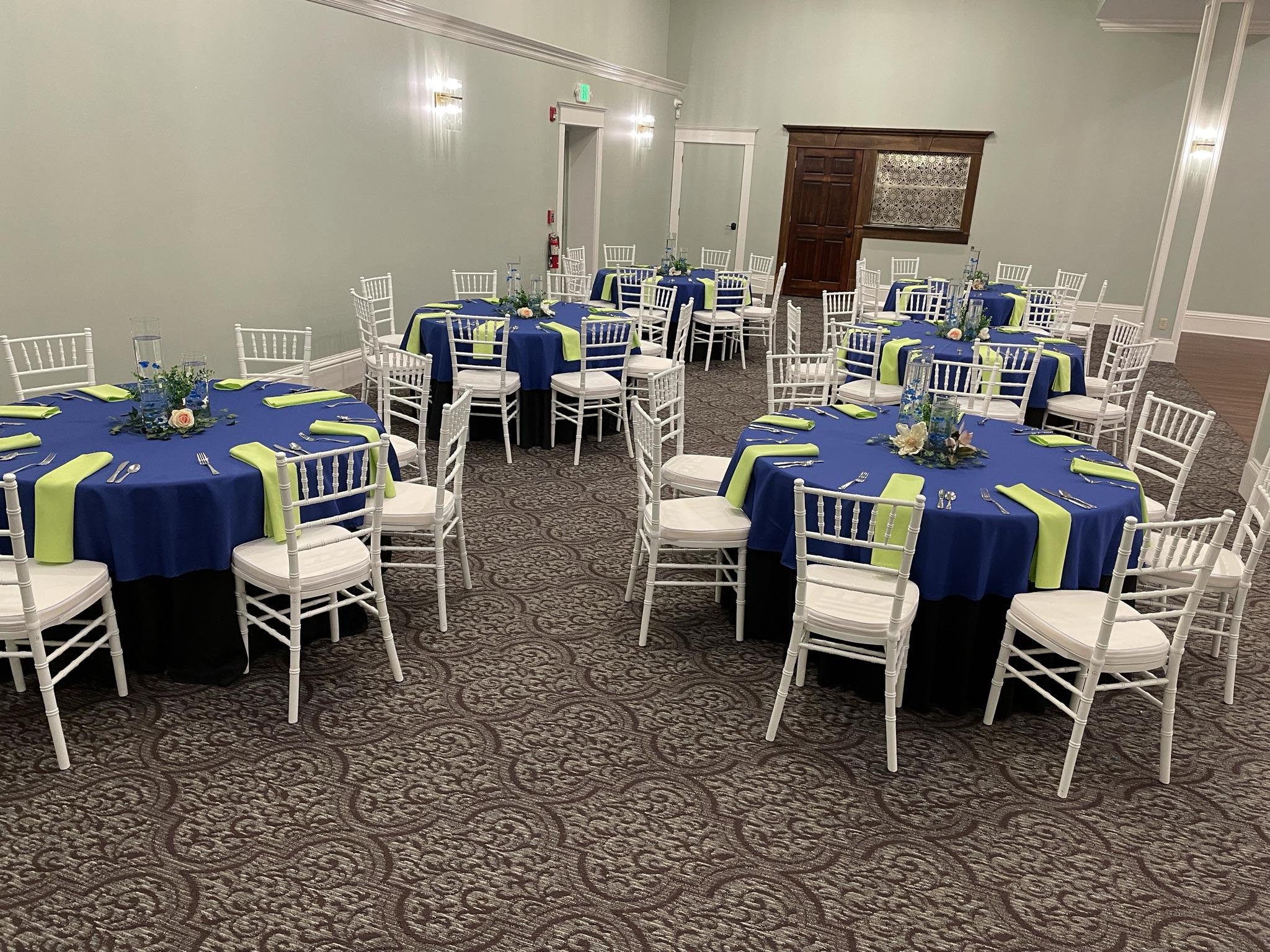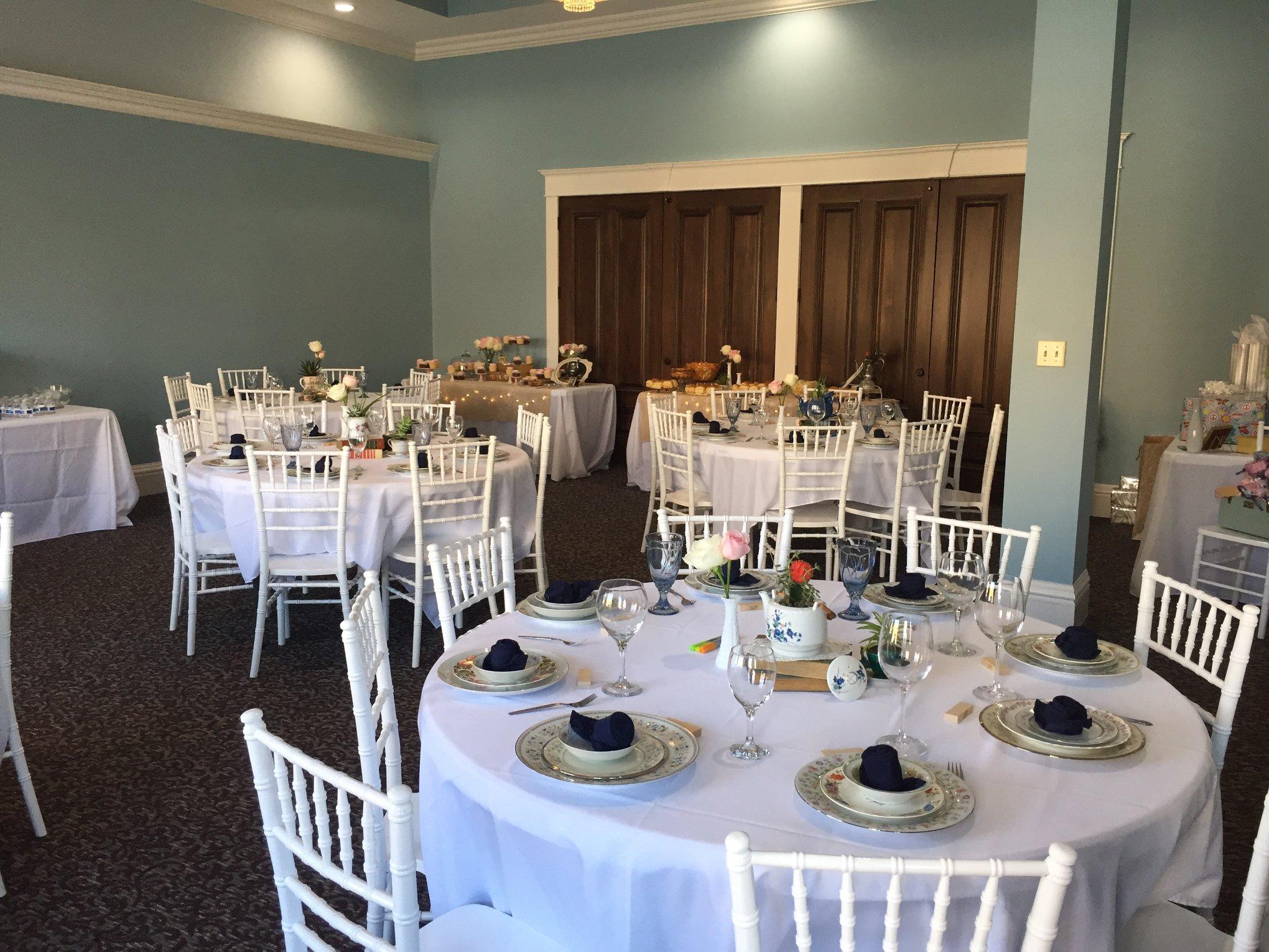 Seating for over 200 guests. Five foot diameter round tables and white Chiavari chairs Bridal packages that include table linens, set up and moreO Optional service bar Stationary dance floor in center of ballroom.