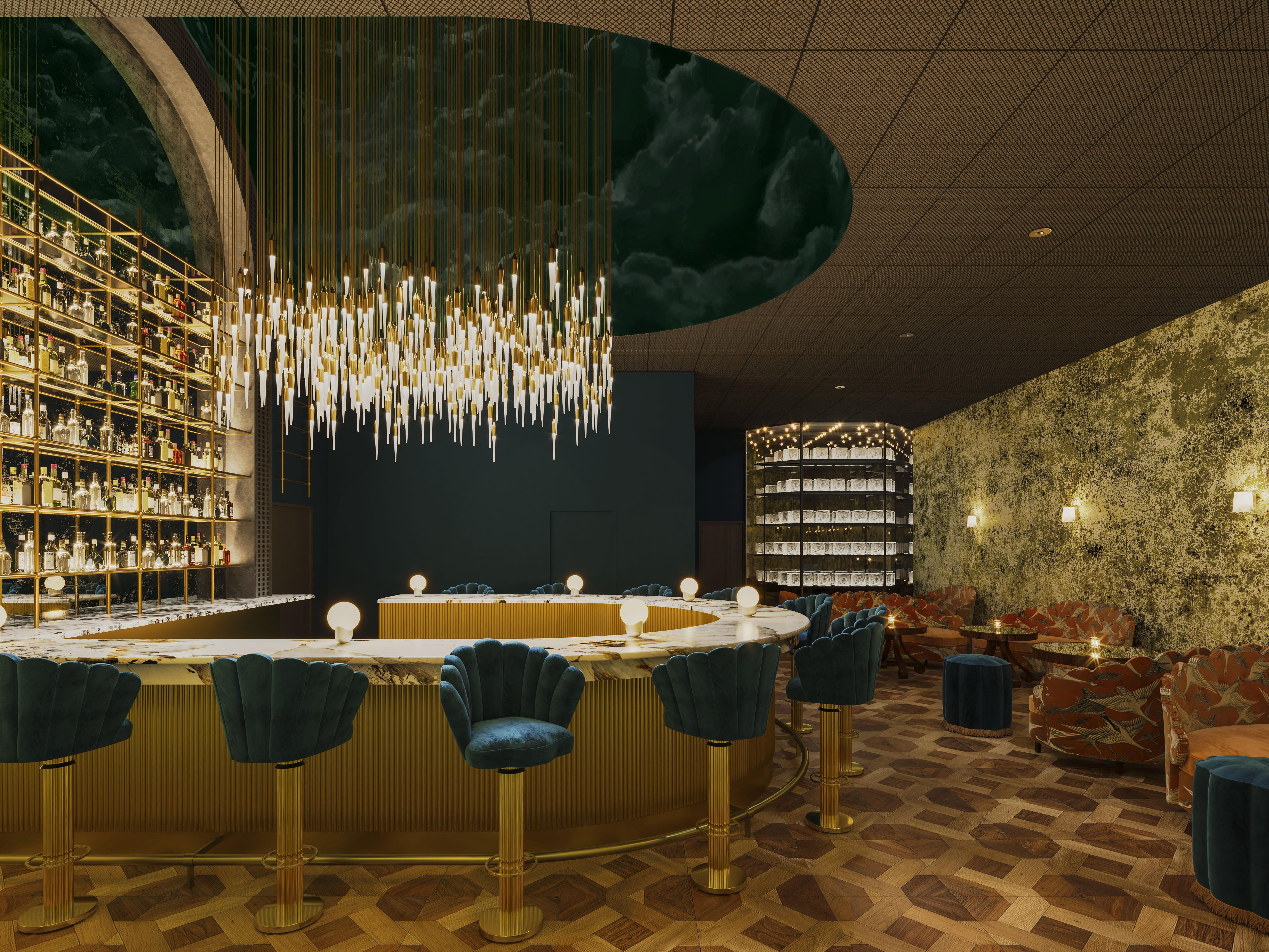 Jbird Cocktails – an art deco horseshoe-shaped bar adorned with both a 16’ backbar and a custom ice-shaped glass chandelier.