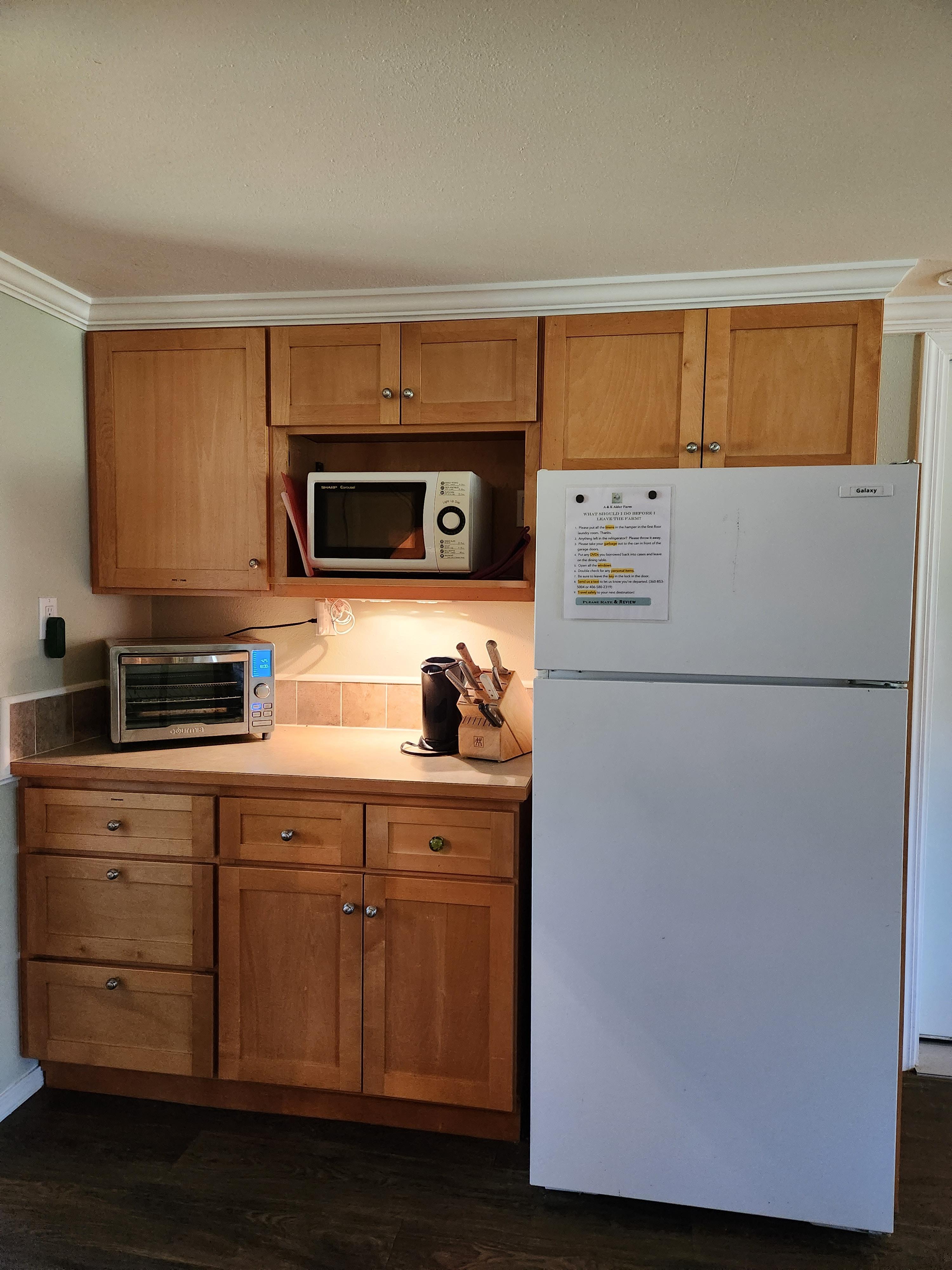 1 full size fridge, 1 mini fridge, kitchen utensils/dishware, clothes hanger, shower, iron and ironing board, hand steamer