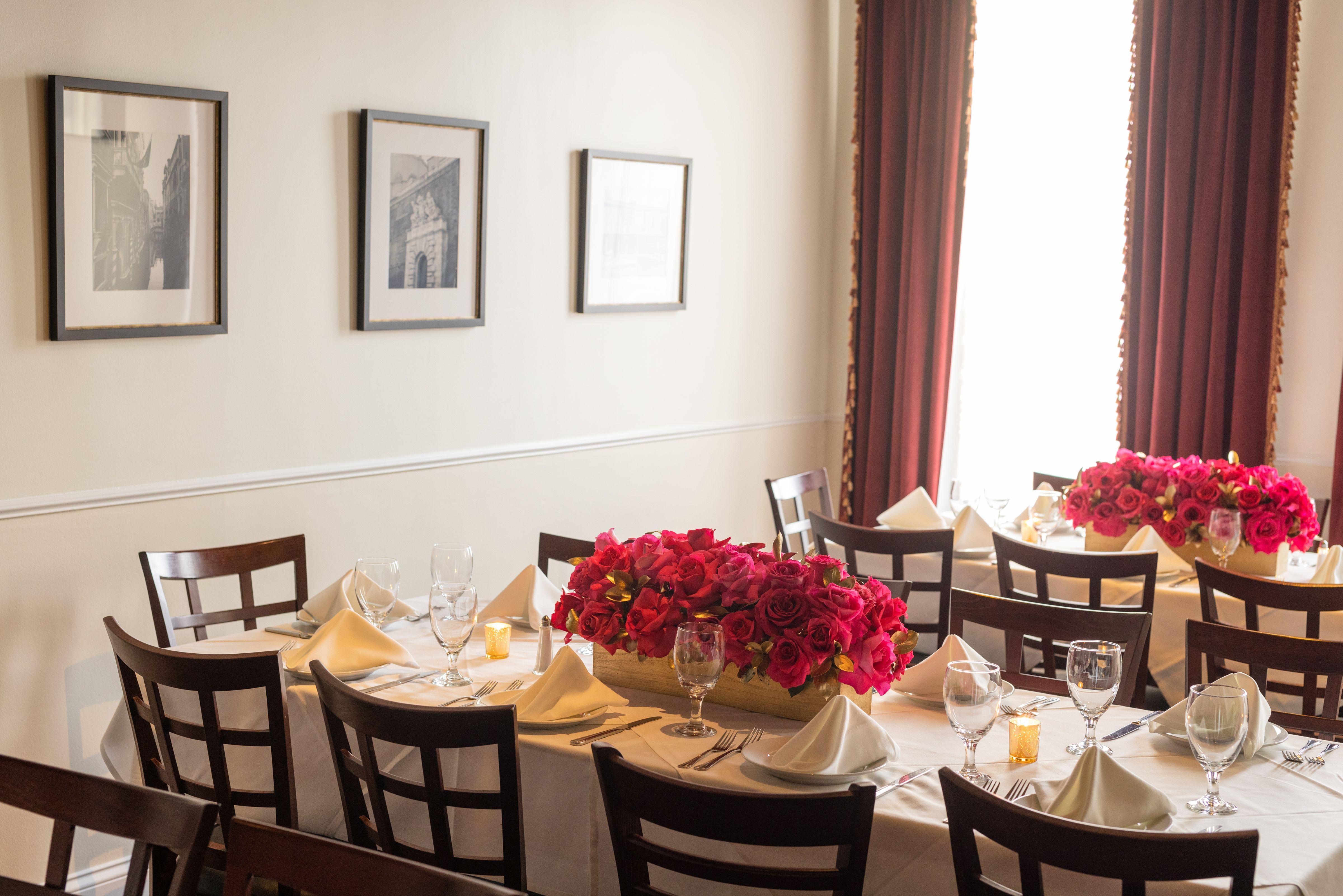 The Sala di Milano at A Tavola combines old-world charm with modern elegance, providing a luxuriously private setting for special events. This space features dark wood accents, sophisticated white table settings, and dramatic red drapery, enhancing its intimate and romantic atmosphere. With a capacity for 40 seated or 65 standing guests, it includes a private entrance, making it ideal for exclusive gatherings. The room's refined ambiance make it a standout choice for memorable celebrations.