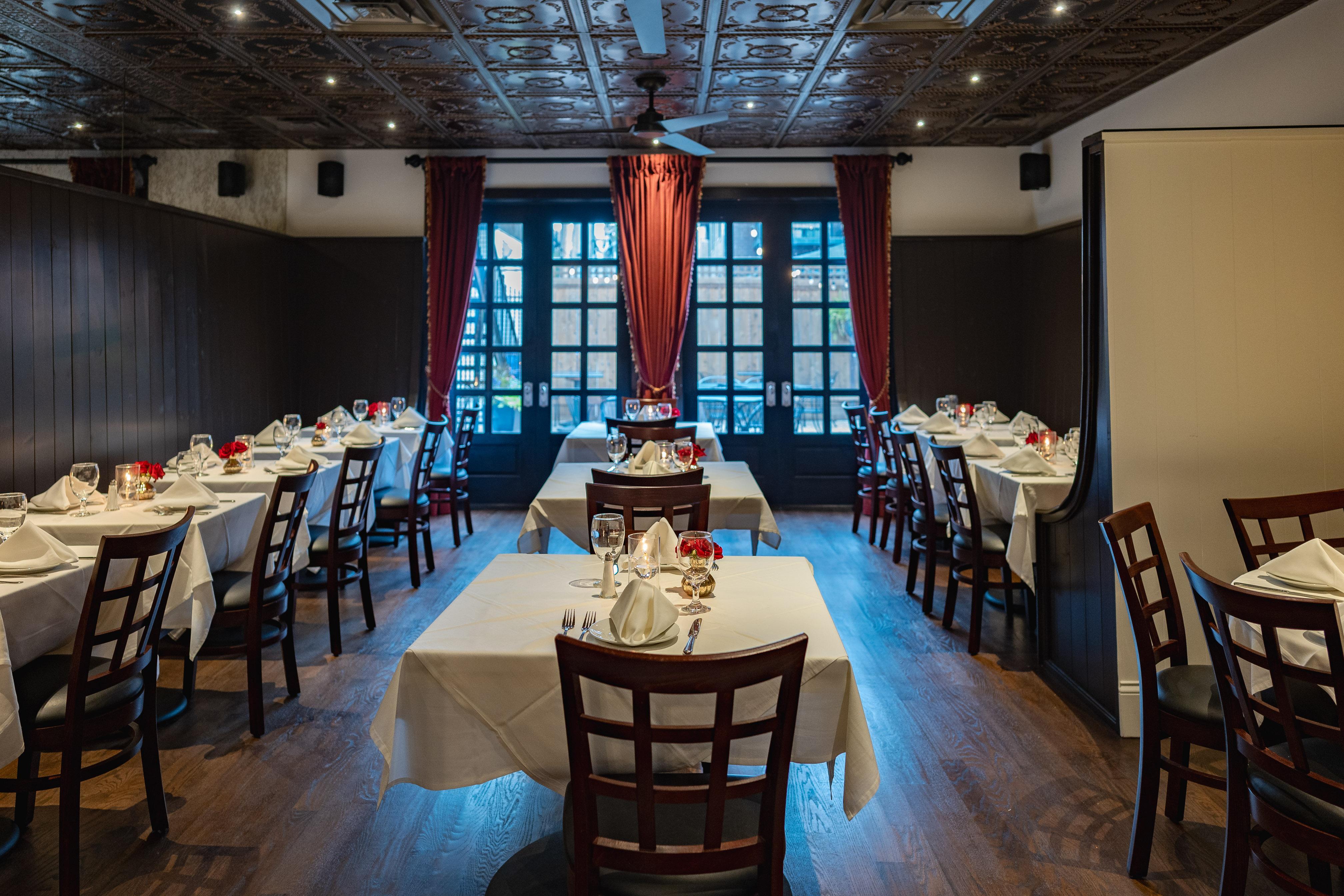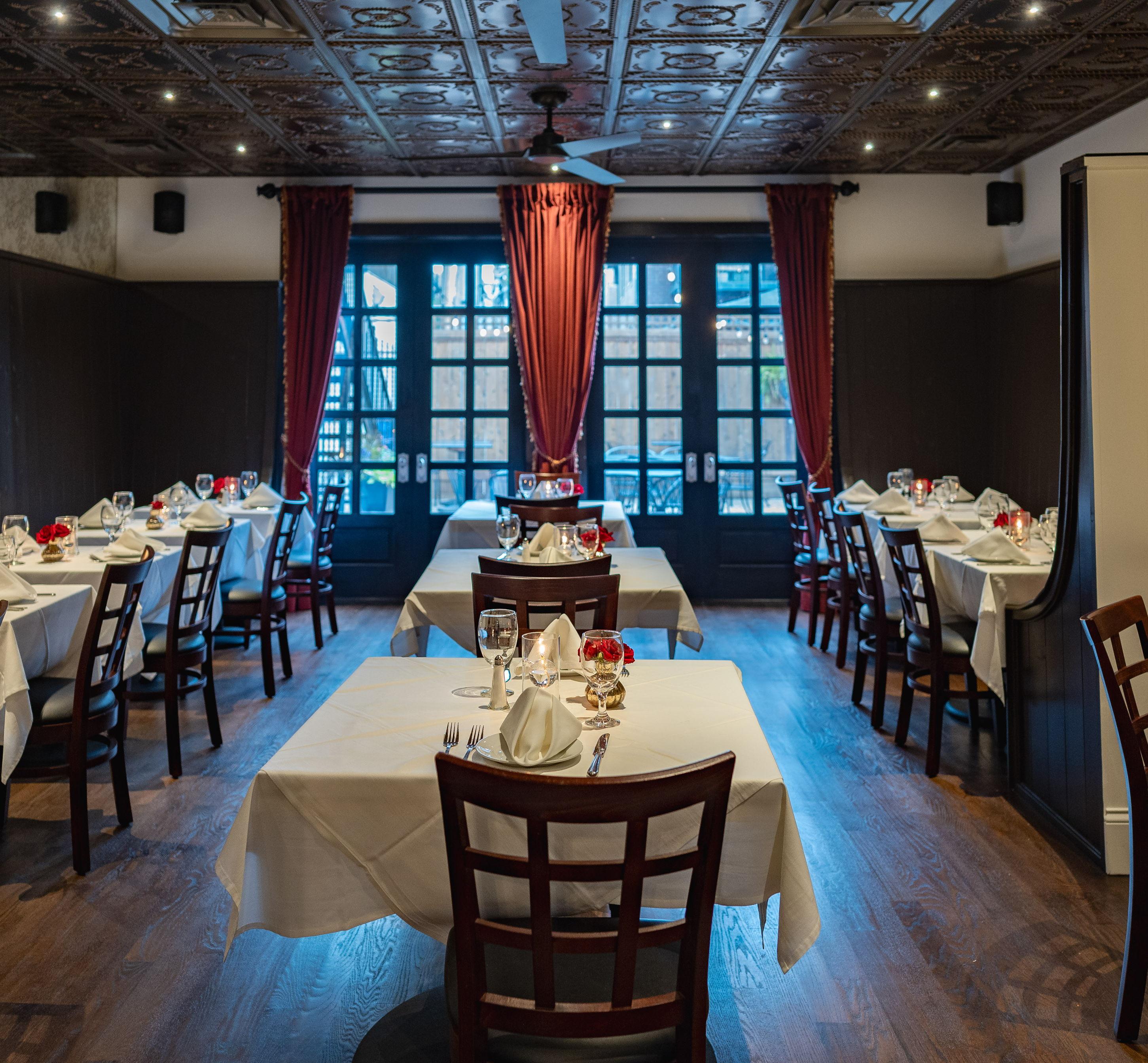 The Main Dining Room offers a classic, romantic, and intimate atmosphere, reminiscent of a cozy Italian home. This private indoor space can accommodate up to 44 seated guests or 65 standing, making it ideal for all special occasions. With its inviting décor, the room fosters a sense of warmth and tradition, perfect for gatherings that require a touch of elegance and a homely feel. Celebrate cherished moments in a setting that beautifully blends classic charm with sophisticated dining.