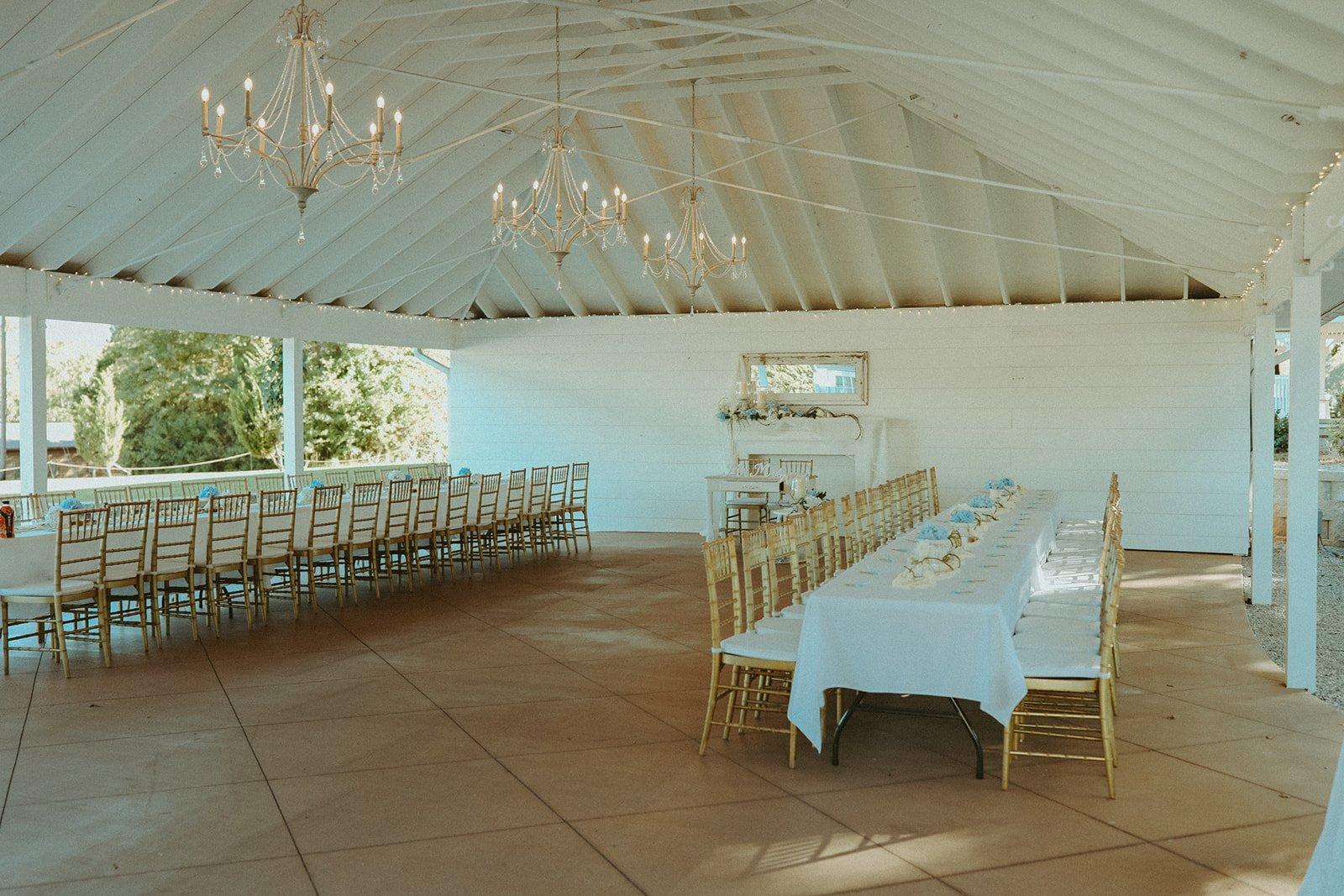 The Pavilion serves as your covered venue space where your ceremony and/or reception is hosted. The open sides allow a breeze to keep the area well ventilated and if needed, we roll down the sides to enclose the space against rain or cold. We add space heaters on cold days for a cozy atmosphere. This space can hold up to 120 guests.