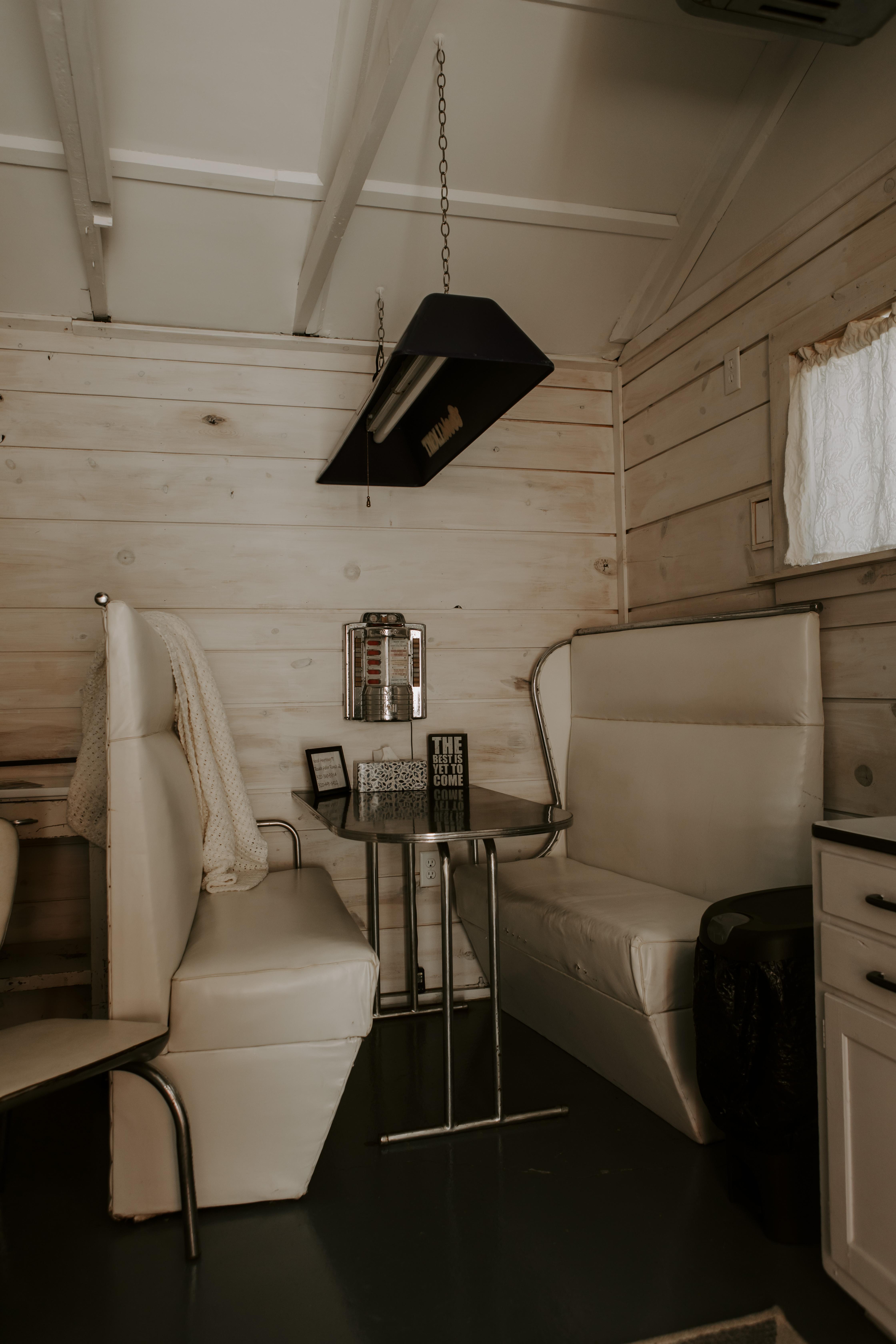 Vintage kitchen with refrigerator Coffee Bar Booth seating. Changing area with chaise seating ,Table and benches, Dressing table, Counter and stools, Additional seating, Outdoor seating area with table and chairs, Private garden. See more about the Cabin at www.adlerranch.com or find us on FB and IG @adlerranch.
