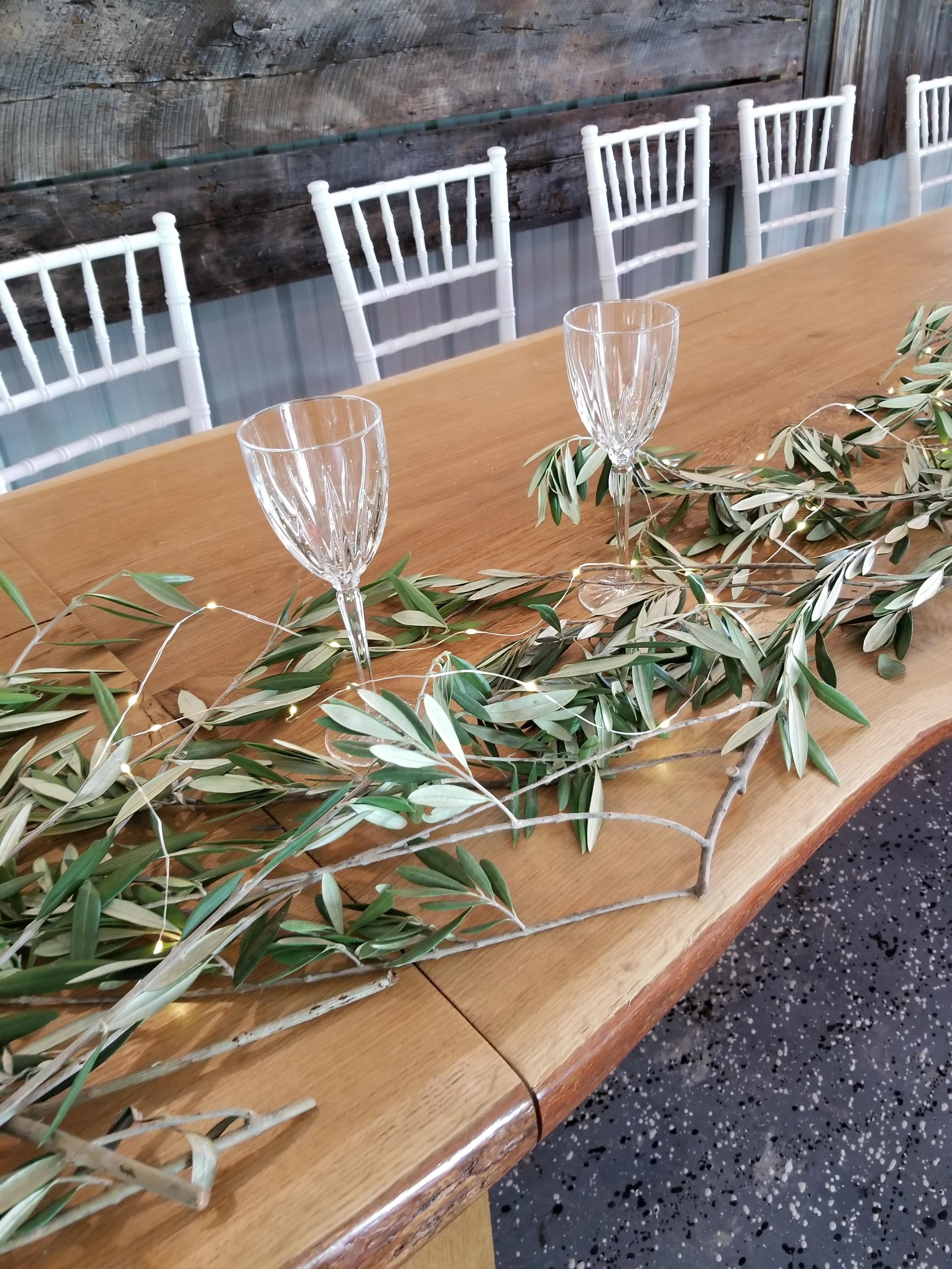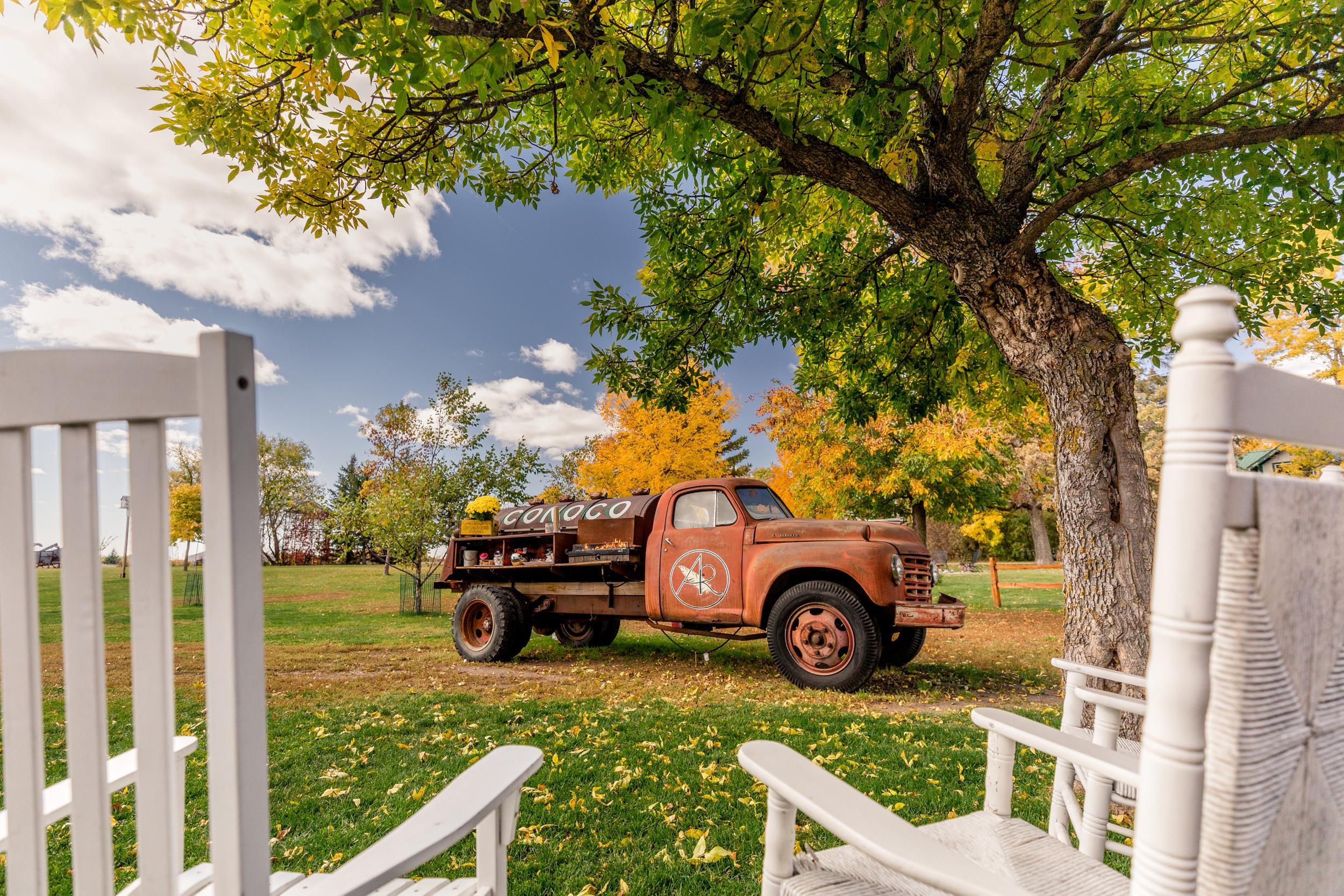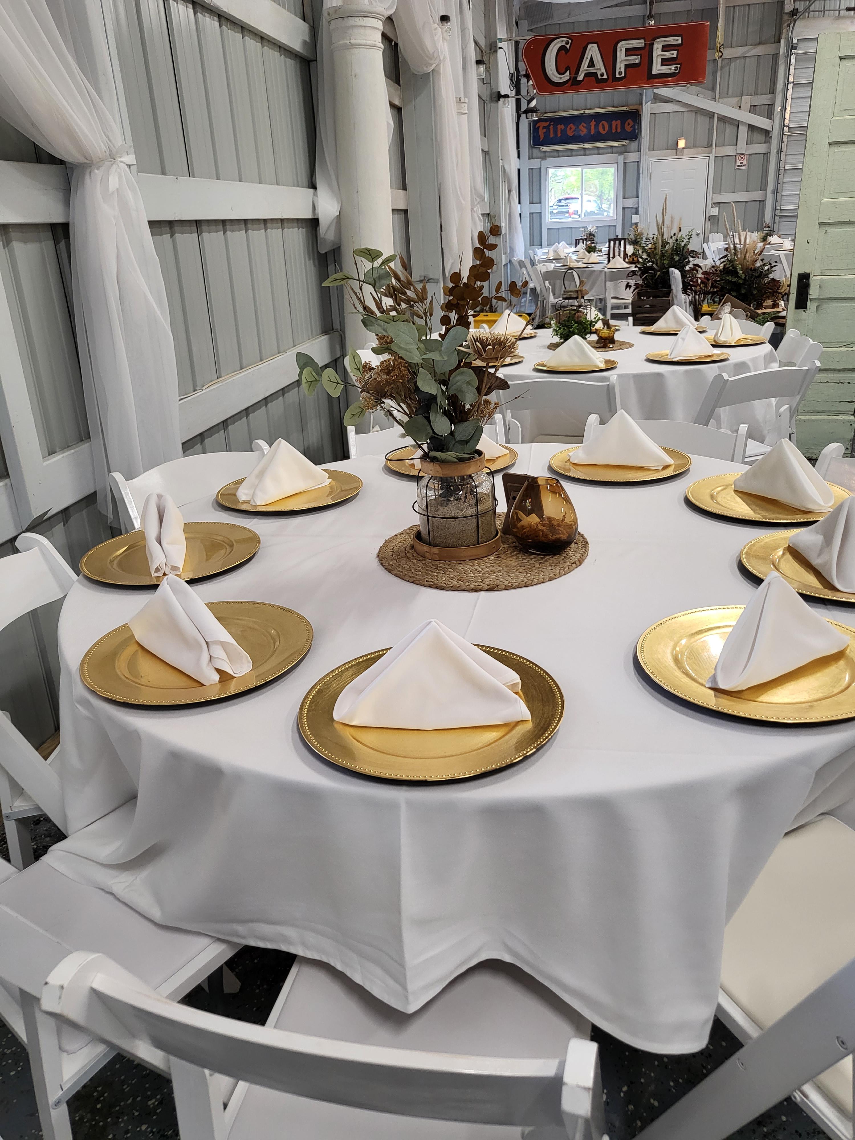 Your rental includes our massive 32 ft long handcrafted table, with gold or white Chiavari chairs, 60 inch round tables, banquet tables for catering, white wood chairs, a farm table for gifts, vintage mailbox as a card box if desired, two TV's for playing a slide show, four overhead ceiling fans, string lighting, chandeliers and very interesting lighting! Access to our Something Borrowed Collection for decorating. Outside decor includes fireplace with seating, see more at www.adlerranch.com.