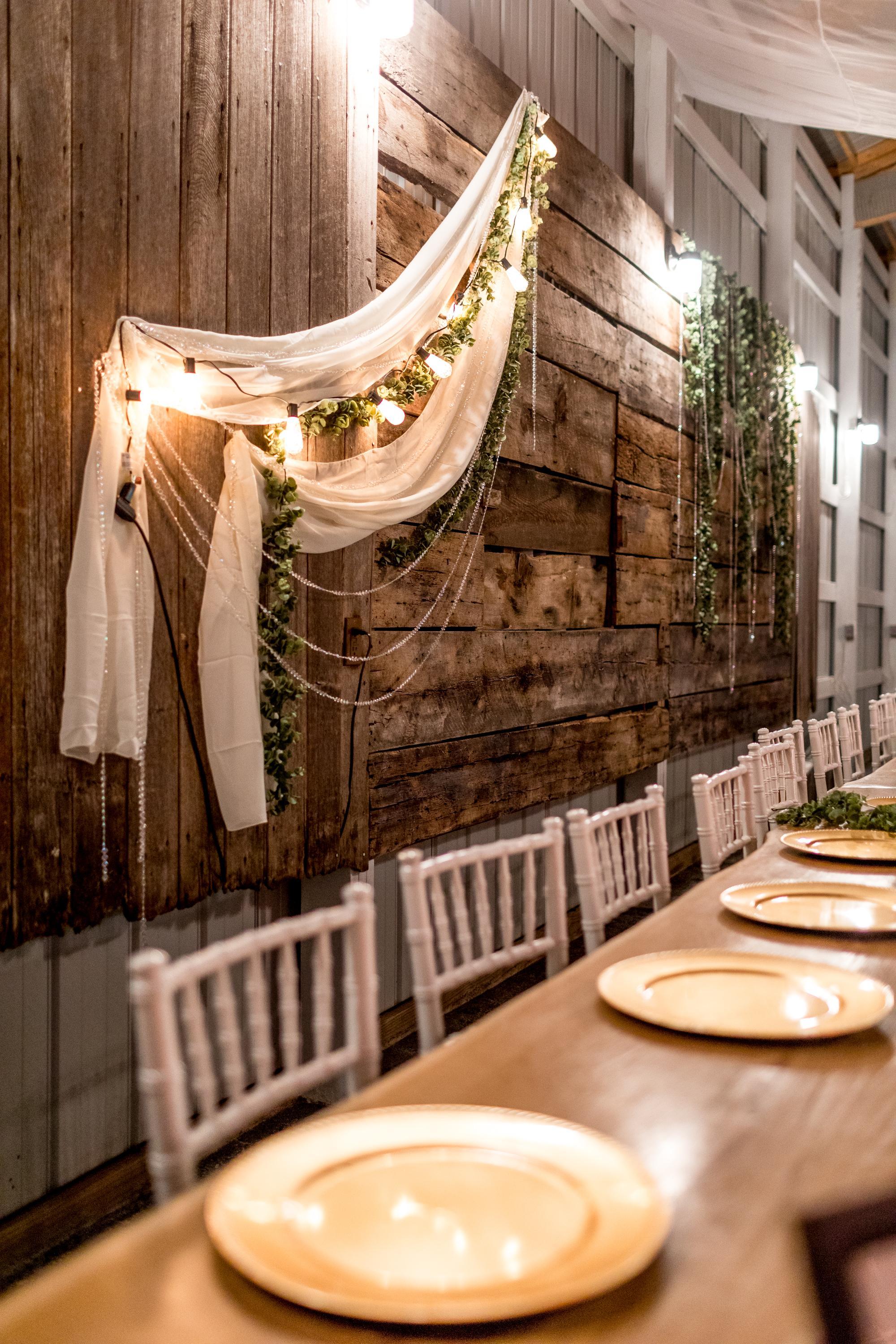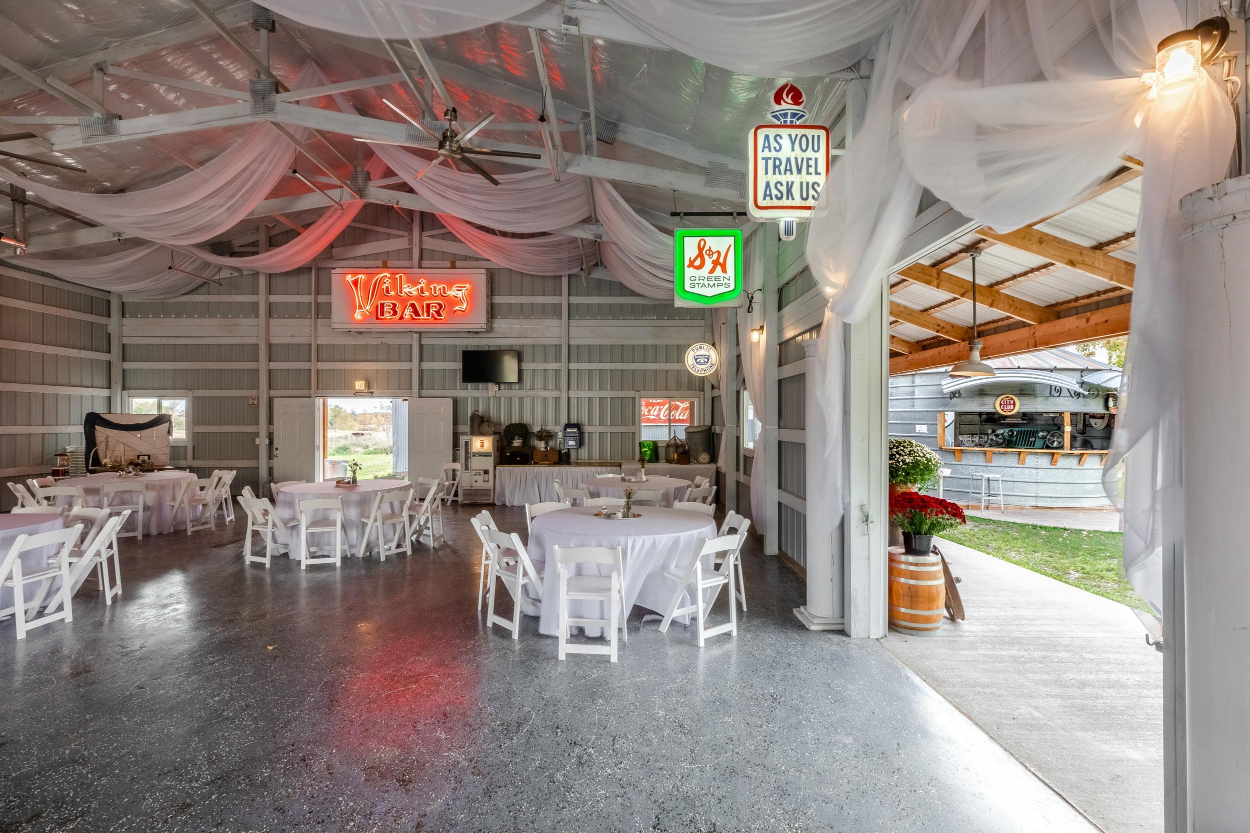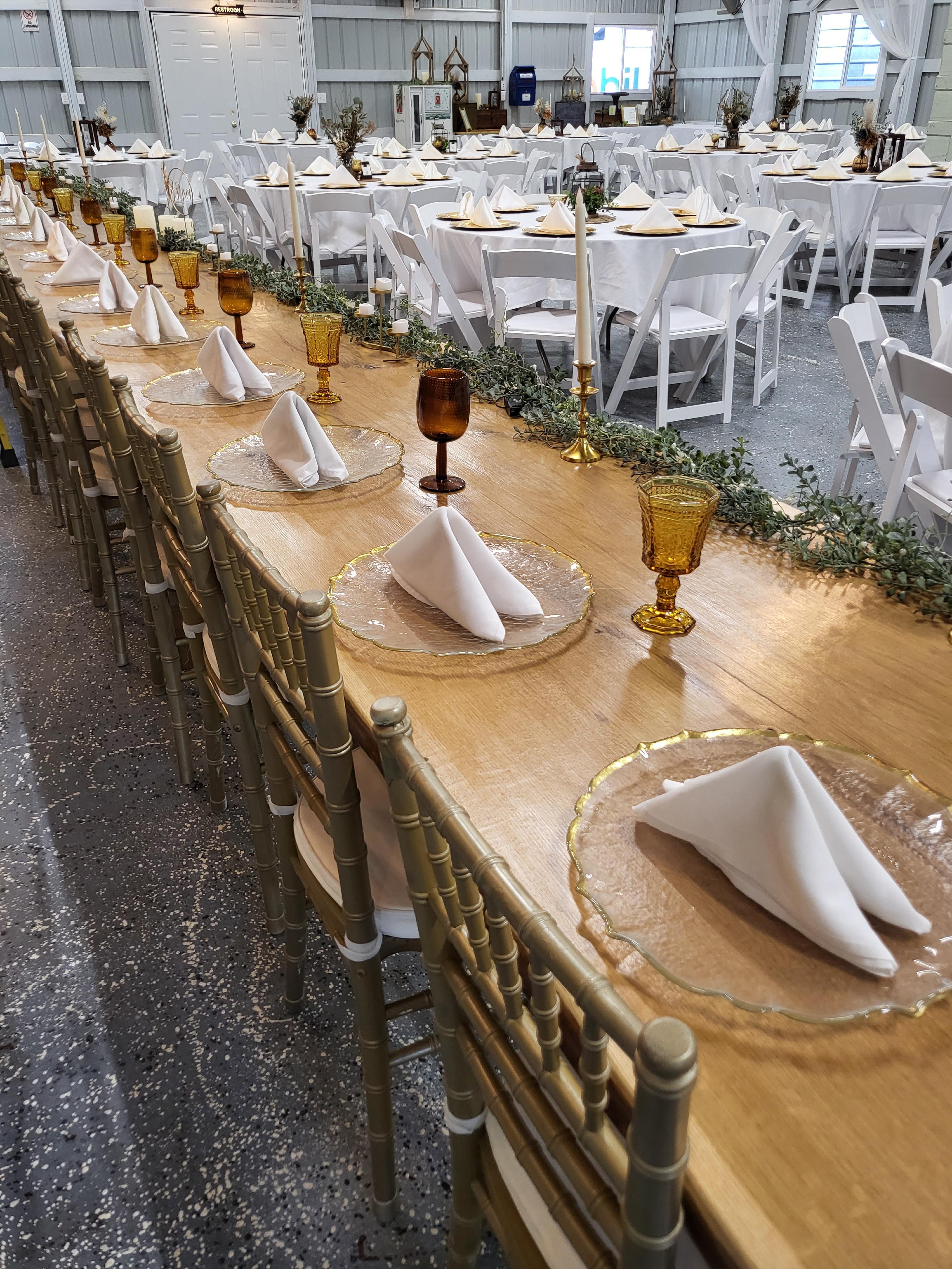 The Adler Ranch Banquet Barn, open on three sides, the banquet area includes two 8 foot overhangs on two sides of the building for additional space and additional bar seating. Your rental includes 60 inch round tables, banquet tables for catering, white wood chairs, a farm table for gifts, vintage mailbox as a card box if desired, two TV's for playing a slide show, four overhead ceiling fans, string lighting. Access to our decorating 'Something Borrowed Collection' is included with your rental.