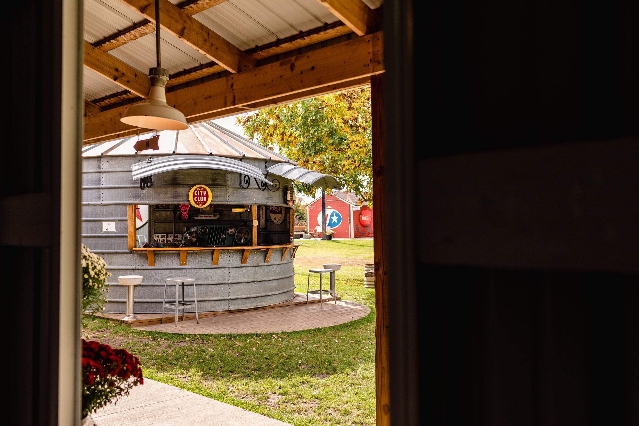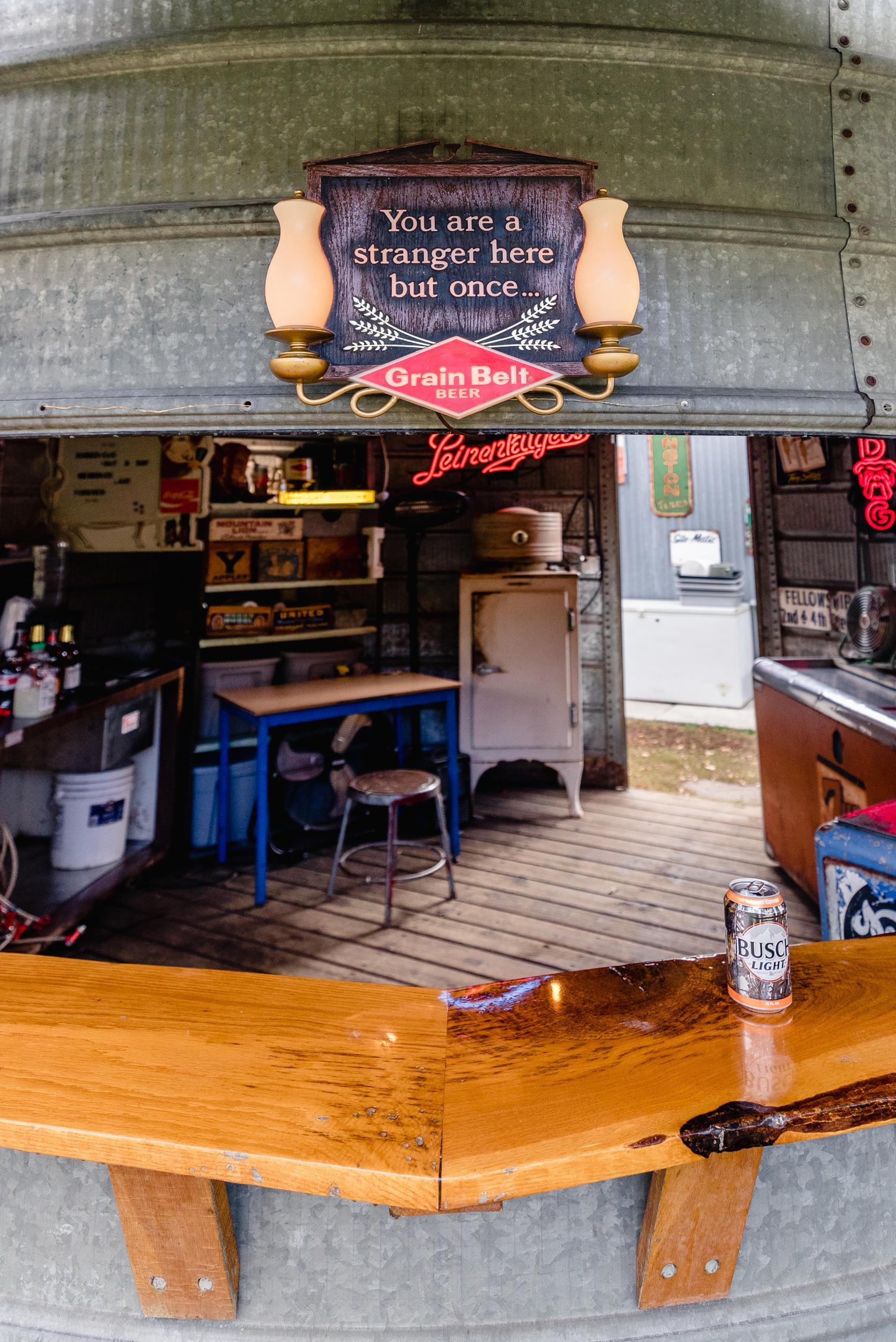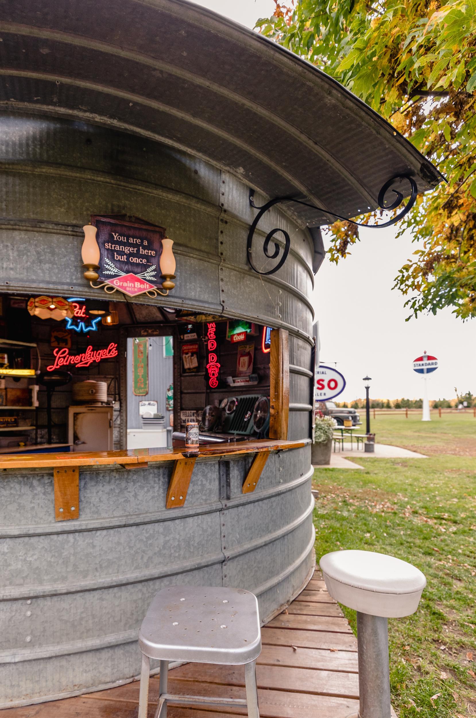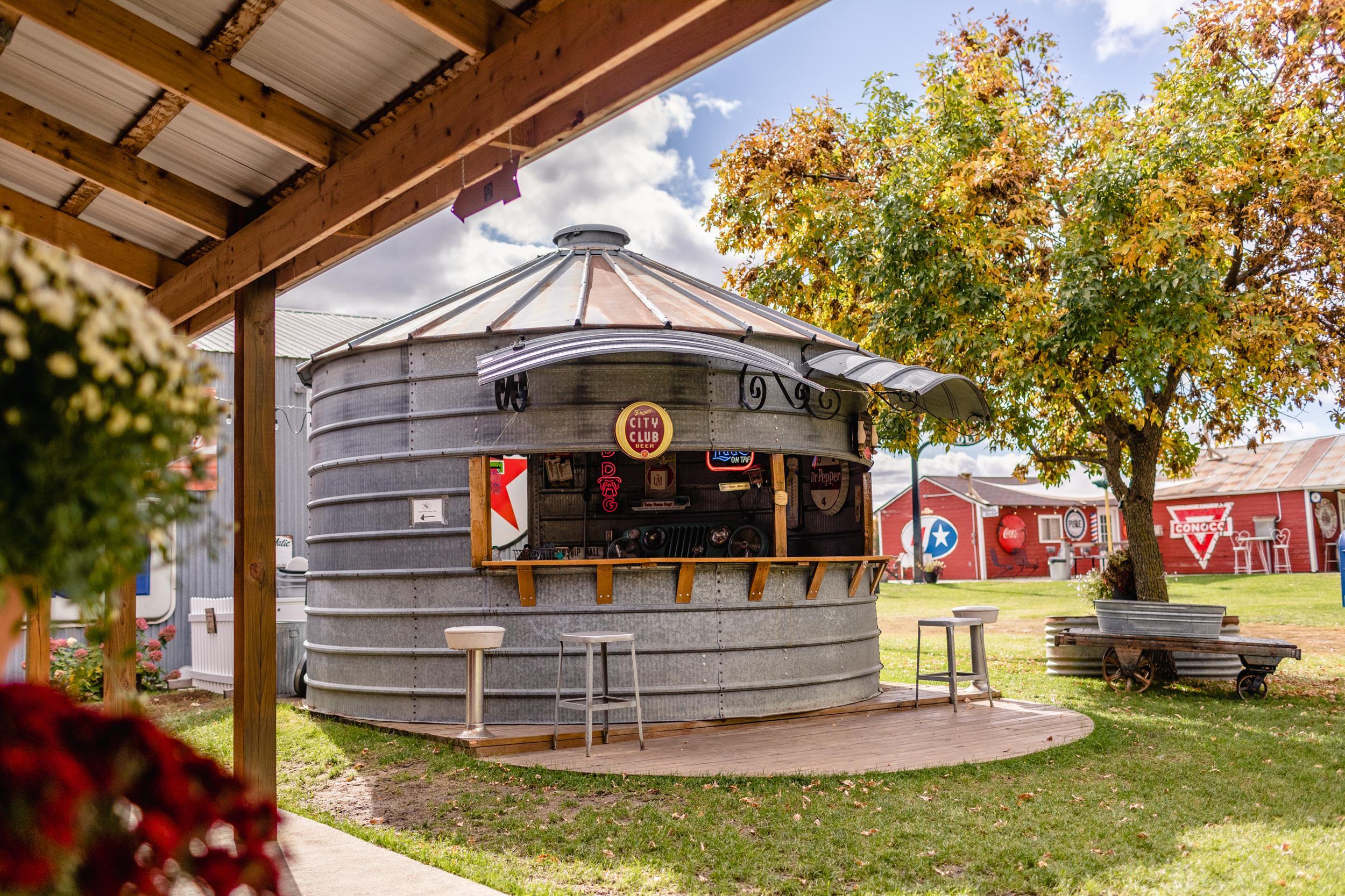 The Grain Bin Bar at Adler Ranch! A vintage grain bin, remodeled to be the bar for your wedding. Your caterer will serve out of the Grain Bin Bar, fitted with vintage coolers, a traffic light, hanging beer signs, vintage signage and a lighted Jeep grill! Located just steps from the Banquet Barn.