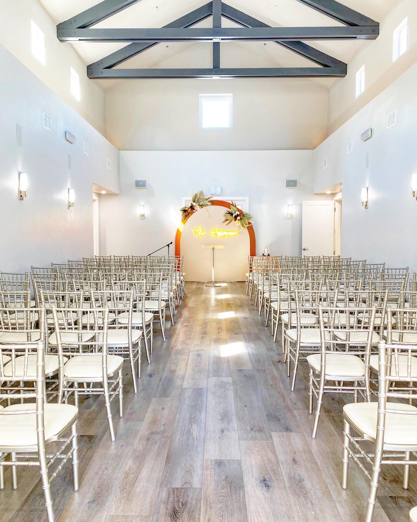 Our beautiful Ceremony Room can accommodate up to 120 guest. Need more space? We can accommodate up to 250 people by using the Reception Room for ceremony services. Our Ceremony Room features 25' vaulted ceilings with exposed rafters, a fully integrated Bose Surround Sound System to handle your music and MC needs, abundant natural light and multi-color backlit lighting for a variety of lighting color options. Beautiful Reception Venue that can accommodate up to 250 people Brides Room stocked with snacks and mini bar, television Grooms Room stocked with snacks and mini bar, television and Xbox. Prep Kitchen Bose Surround Sound System Large Televisions throughout Bistro Lighting Farm Wood Tables Chiavari Chairs