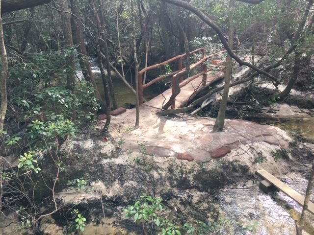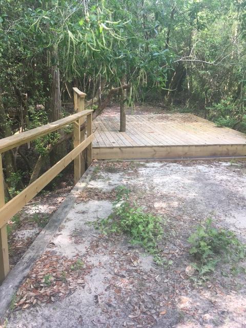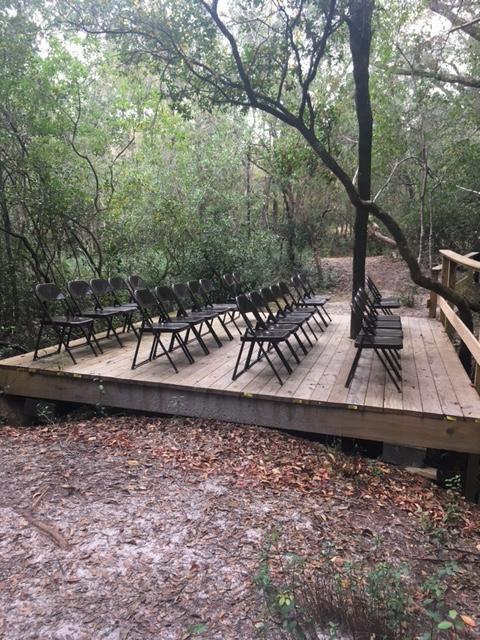 * platform for limited seating * 2 consecutive bridges to the wedding area * remote without power or restrooms * rugged parking